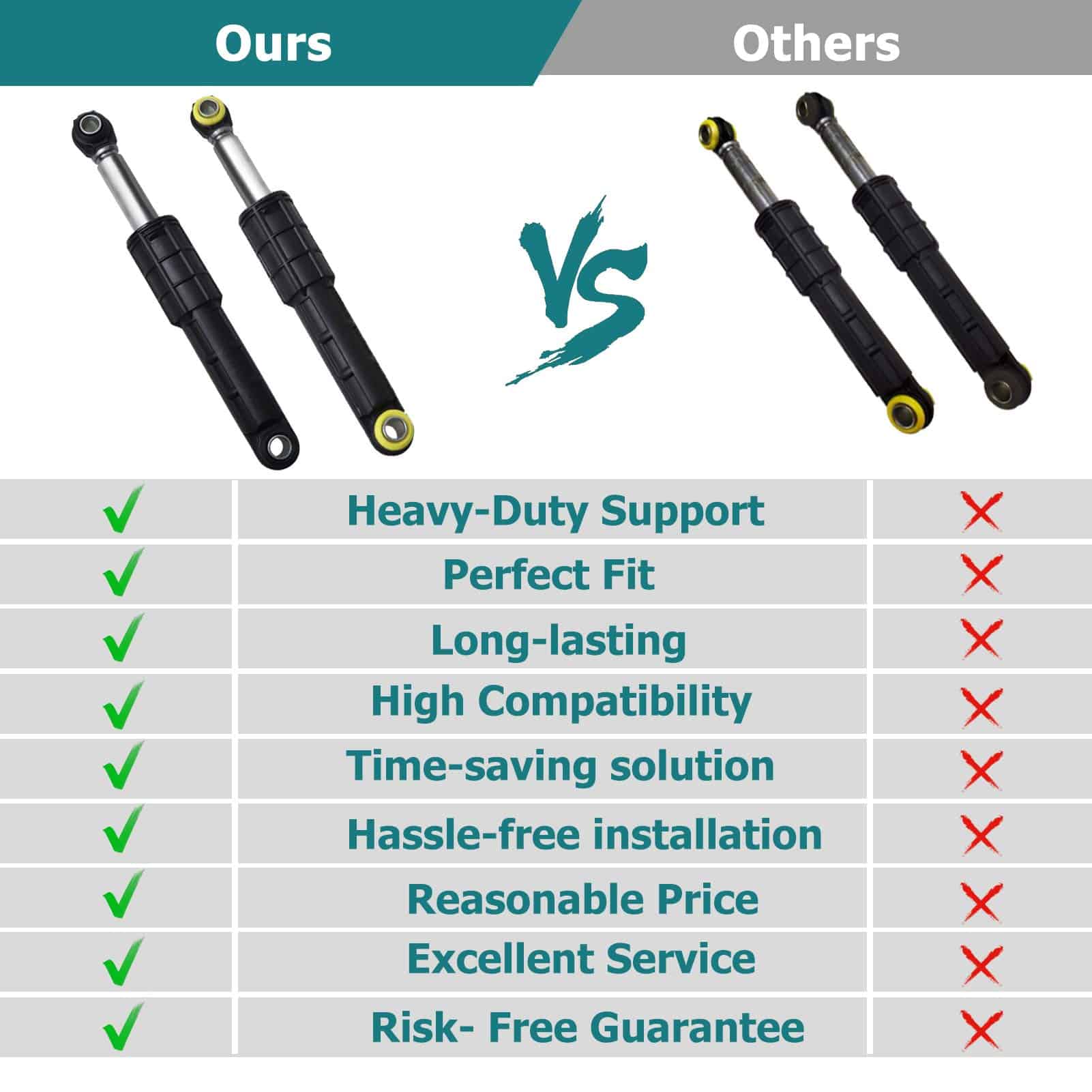 Kit de amortiguadores de lavadora DC66-00470A & DC66-00470B con garantía de 12 meses. No necesita correr riesgos de compra, compre con total confianza. Incluye 2 amortiguadores DC66-00470A, 2 amortiguadores DC66-00470B. Reemplaza directamente los siguientes números de pieza DC66-00470A, DC66-00470B, DC66-00650C, DC66-00650D, AP4206426, 2020946, PS4212219, AP4456255 y PS4212220, etc. Compatible con lavadoras Samsung. El amortiguador DC66-00470A y DC66-00470B es una pieza de equipo original, compatible con los modelos de lavadoras Samsung WF20, WF21, WF32, WF33, WF35, WF39, WF40, WF41, WF42, WF43, WF44, WF45, WF46, WF50, WF51, WF52, WF56, WV55, WV60, etc. Repare los siguientes síntomas: reemplace los amortiguadores si los resortes de suspensión están intactos y la tina de la lavadora golpea contra el gabinete durante el ciclo de centrifugado. Conecte el equipo de la fuente de alimentación antes de reemplazar las piezas. Necesitará guantes de trabajo para proteger sus manos. Vea un video de instalación en YouTube en línea para descubrir cómo solucionarlo. También puede tomar fotografías antes de quitar cada pieza. GARANTÍA POSVENTA: Para cualquier problema de calidad, le reenviaremos uno nuevo o le daremos un reembolso completo incondicional. Garantía de devolución del 100% del dinero, por cualquier motivo, si no está satisfecho, puede solicitar un reemplazo o un reembolso completo. La satisfacción del cliente es nuestra búsqueda incansable. Si no está satisfecho con el producto, no se apresure a dejar un comentario negativo. ¡Contáctenos! ¡Le mostraremos una actitud sincera y una solución satisfactoria!