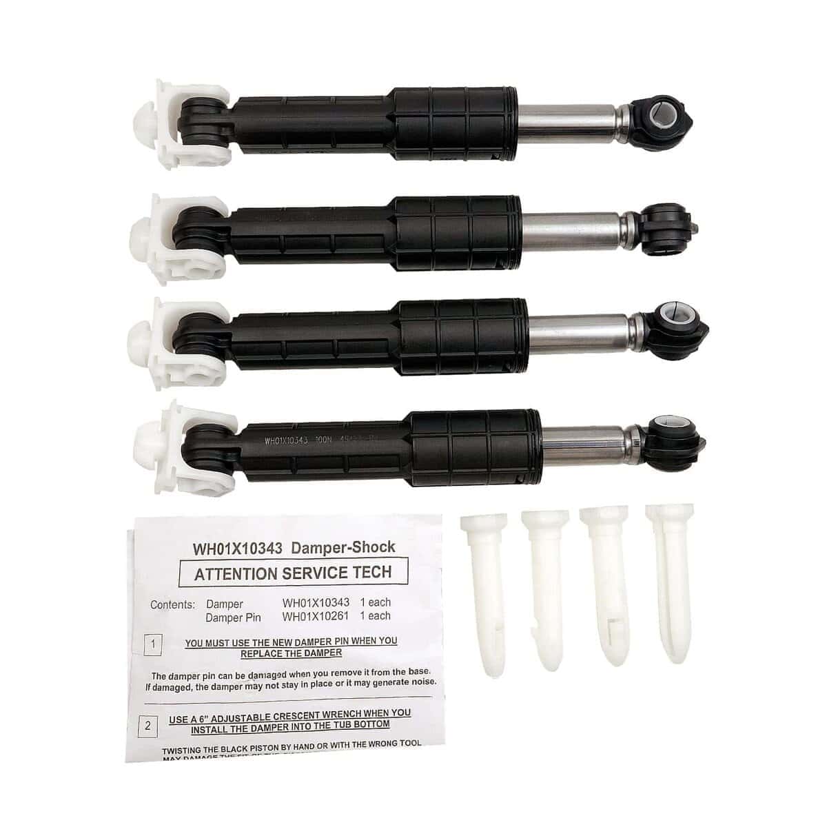 Kit de amortiguadores para lavadora WH01X20826, compatible con lavadoras GE, General Electric y Kenmore. Este kit de amortiguadores de impacto es un reemplazo de alta calidad para los modelos WH01X10260, 1264427, AH1482318, AP4265856, EA1482318, PS1482318, WH01X10343, WH01X10260, WH01X10425, WH01X10385, entre otros. Los amortiguadores de impacto juegan un papel importante en las lavadoras, ya que afectan la producción de ruido durante el funcionamiento, ayudan a amortiguar y equilibrar el tambor, y evitan vibraciones incluso a altas velocidades. Si tu lavadora está funcionando de manera errática, haciendo ruido o temblando, el reemplazo del amortiguador de impacto podría ser la solución. Este kit incluye 4 amortiguadores y 4 pasadores para una fácil instalación. La satisfacción del cliente es nuestra prioridad, por lo que te brindaremos una atención sincera y una solución satisfactoria a cualquier problema que puedas tener con tu lavadora.