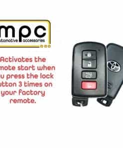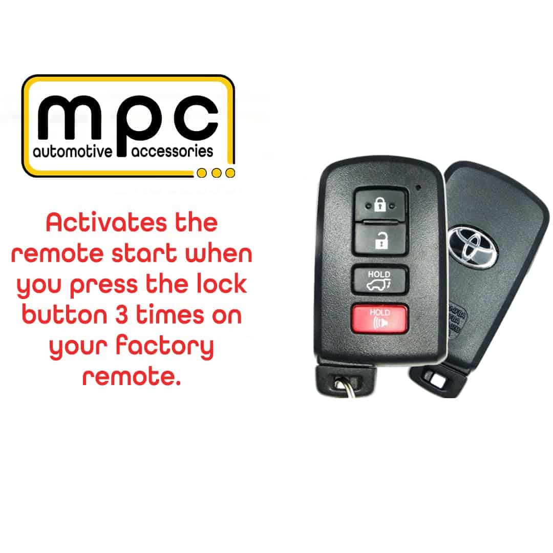 Este es un kit de arranque remoto completo compatible con los vehículos selectos de Toyota. Incluye módulo de interfaz de datos de arranque remoto todo en uno y arnés en T. Firmware preinstalado para su vehículo. Todos los componentes requeridos para la instalación están incluidos. Transmisión automática solamente. Para prevenir robos, el arranque remoto apagará el vehículo cuando se abra una puerta. Este es un sistema de arranque remoto adicional para vehículos con entrada sin llave existente. No incluye controles remotos; esto utiliza sus controles remotos de fábrica para arrancar su vehículo presionando el botón de «bloqueo» tres veces. No es necesario llevar controles remotos adicionales. Caliente o enfríe su automóvil desde la comodidad de su hogar. Este kit utiliza un arnés en T que se conecta de forma plug & play, lo que reduce drásticamente la cantidad de conexiones de cableado que los sistemas típicos requieren. Compatible con los siguientes vehículos de Toyota: Toyota Highlander 2014-2019, Toyota C-HR 2018-2019, Toyota Land Cruiser 2016-2018. Opciones disponibles (a un costo adicional): MPC Smartphone App Ready: Agregue módulo de interfaz. Solo para EE. UU. — EVO-REMOTE-1 Ready: Agregue (2) controles remotos compactos de 1 botón sin llave de 1 vía. — EVO-REMOTE-4 Ready: Agregue (2) controles remotos de 4 botones de largo alcance de 2 vías sin llave. Soporte técnico de MPC: proporcionamos un enlace para descargar la exclusiva hoja de consejos de instalación con derechos de autor de MPC, creada por los técnicos profesionales de MPC, para ayudarlo durante el proceso de instalación. En caso de que tenga dificultades o preguntas sobre las opciones, ofrecemos soporte técnico en EE. UU. de lunes a viernes de 9 a 17 hora de Arizona. También puede abrir un ticket de soporte en línea las 24 horas los 7 días de la semana.