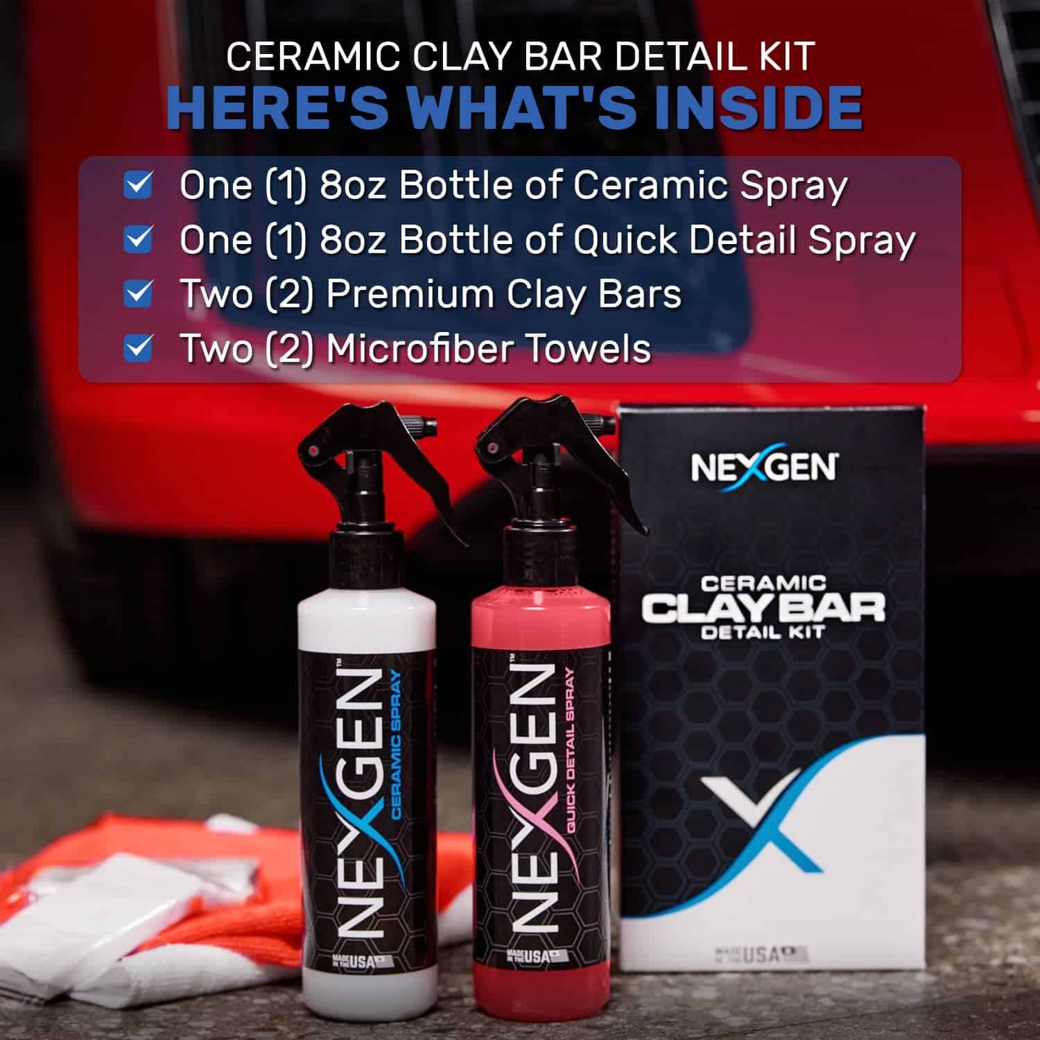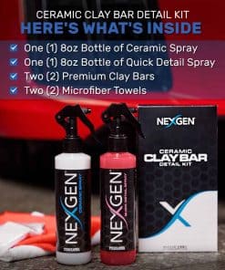 1. UN KIT DE CUIDADO DE COCHES COMPLETO PARA DOMINARLOS A TODOS: El kit de detalle de coche NexGen contiene todo lo que necesitas para nutrir y proteger cada parte de cualquier vehículo, desde la pintura hasta el vidrio, metal, molduras, parabrisas y ruedas: 1 x Spray Cerámico de 8 oz, 1 x Spray Rápido de Detalle de 8 oz, 2 x Barra de Arcilla Premium Nexgen, 1 x Toalla de Microfibra Roja y 1 x Toalla de Microfibra Blanca.