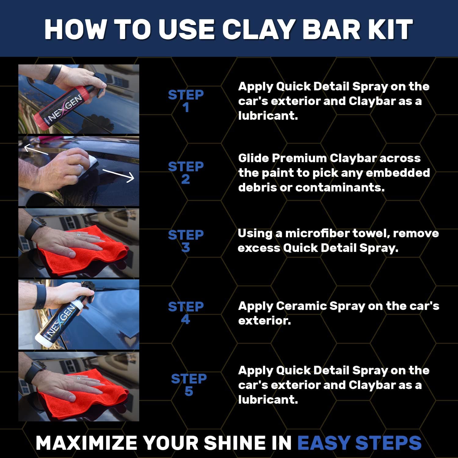 4. LIMPIEZA RÁPIDA Y FÁCIL ESTÁNDAR PROFESIONAL: Con el kit de detalle de coche de Nexgen obtienes una limpieza profunda en 4 sencillos pasos. Utiliza el Spray Rápido de Detalle para lubricar la superficie del coche, desliza la barra de arcilla premium sobre la pintura para levantar impurezas, luego pule hasta un brillo brillante con los paños de microfibra extra suaves, y cubre con el spray cerámico.