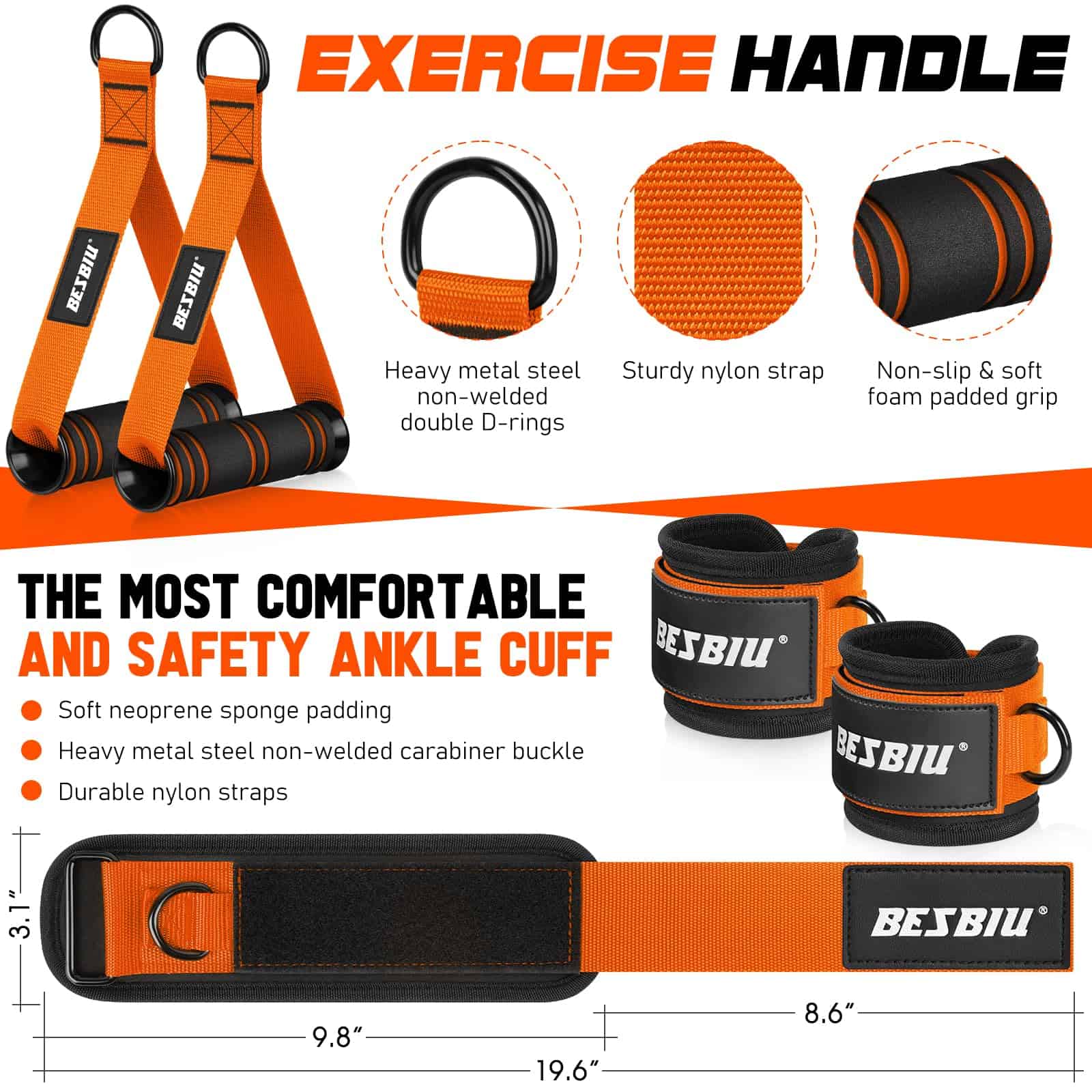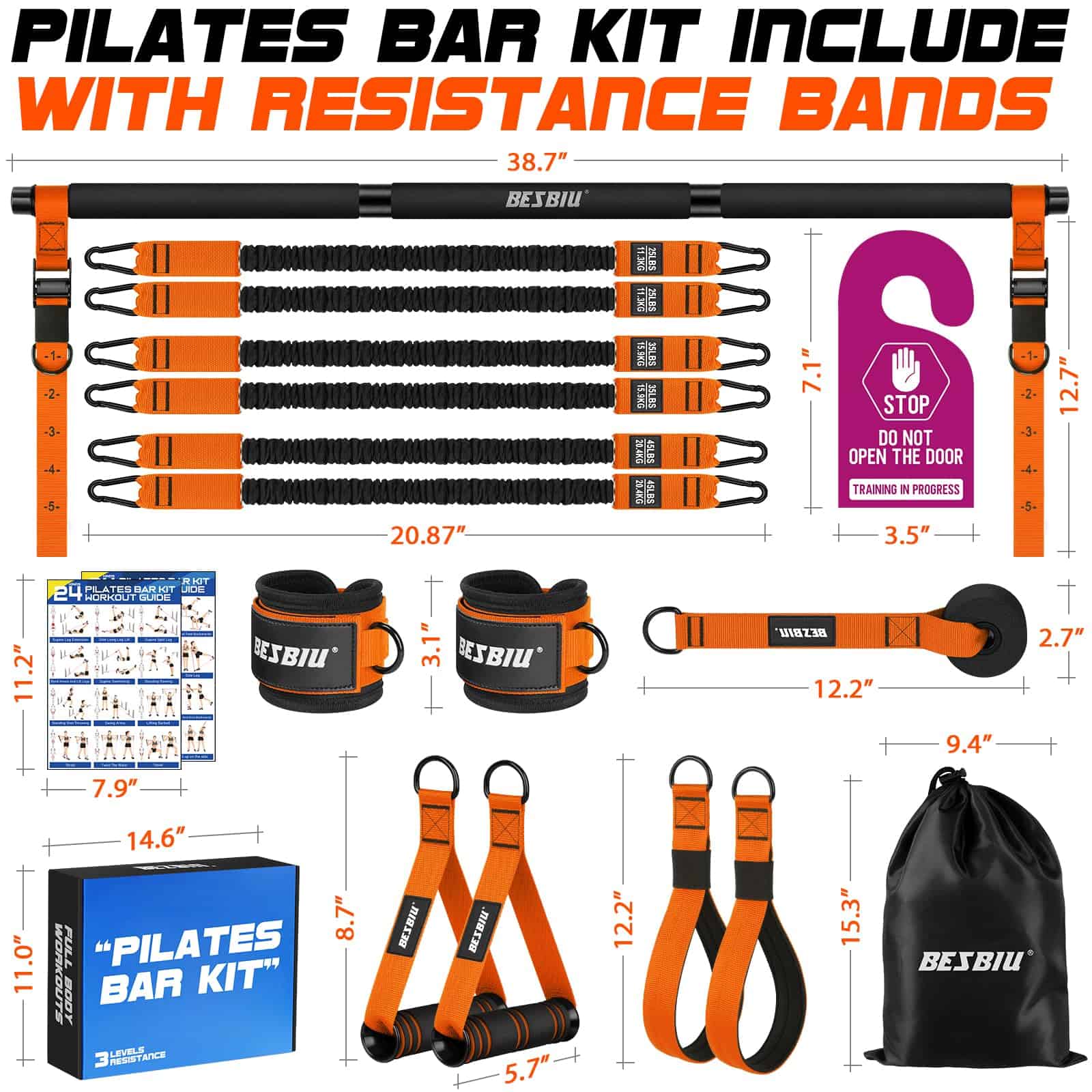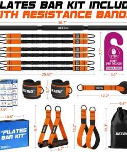 TODO EN UNO EQUIPO DE FITNESS PARA GIMNASIO EN CASA – El kit de barra de pilates de BesBiu es el equipo de pilates más completo para entrenamientos en casa del mercado. ¡Máquina de entrenamiento de cuerpo completo perfecto de 19PCS: 1 barra de bandas de resistencia + 6 bandas de entrenamiento pesadas + 2 mangos acolchados antideslizantes + 2 correas acolchadas de material SBR para los pies + 2 anclajes de puerta gruesos + 2 correas de tobillo acolchadas ajustables + 1 póster de ejercicios de barra de pilates + 1 tarjeta de advertencia + 1 bolsa de transporte + 1 caja de regalo. El kit de barra de pilates es muy amistoso para aquellos que miden entre 5.25-6.25 pies de altura. Por debajo de este rango de altura, los anclajes de puerta, los mangos y las correas para los tobillos enriquecen tus métodos de ejercicio para todas las personas. El equipo de pilates con barra yoga atiende tanto a ejercicios para la parte superior como para la parte inferior del cuerpo. Estamos bastante seguros de que estarás muy impresionado con la durabilidad, portabilidad, versatilidad y alta calidad de nuestra máquina de pilates reformadora.