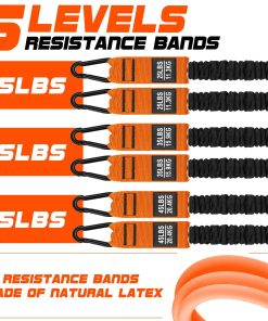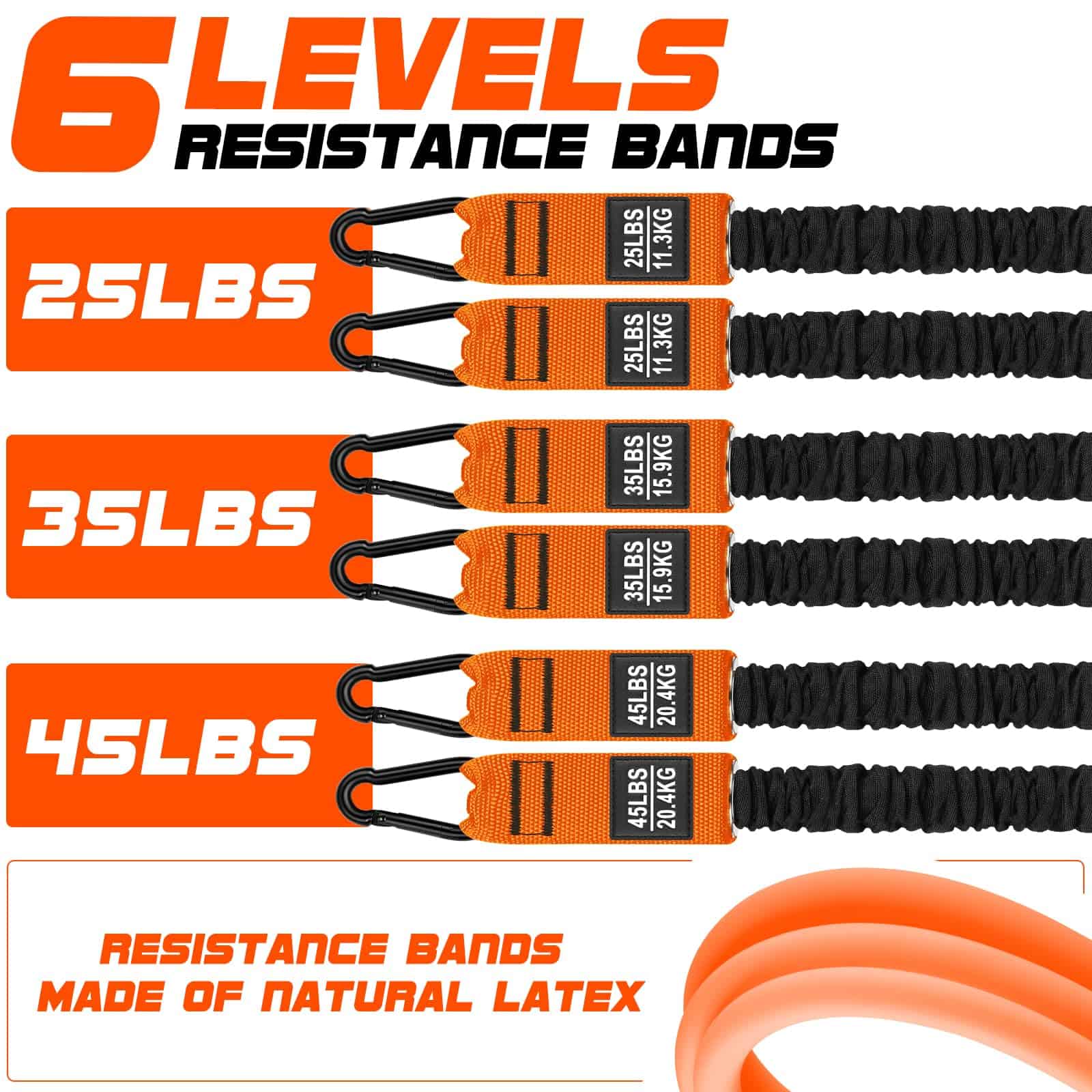 2. BANDAS DE RESISTENCIA PESADA DE 210LBS: 6 bandas de ejercicio, 2x25lb, 2x35lb, 2x45lb tubos, permitiendo hasta 210lb de resistencia. Cada banda de resistencia está envuelta en una duradera funda de nylon, para una máxima longevidad y seguridad durante el uso. Material de látex natural con alta elasticidad y resistencia al desgarro, que puede soportar ejercicios diarios intensos. Ya sea principiante o avanzado, estas bandas de ejercicio se adaptan a su nivel de fuerza. Nuestro kit de barra de pilates con bandas de resistencia es adecuado para alturas de 5,25′ a 6,25′.