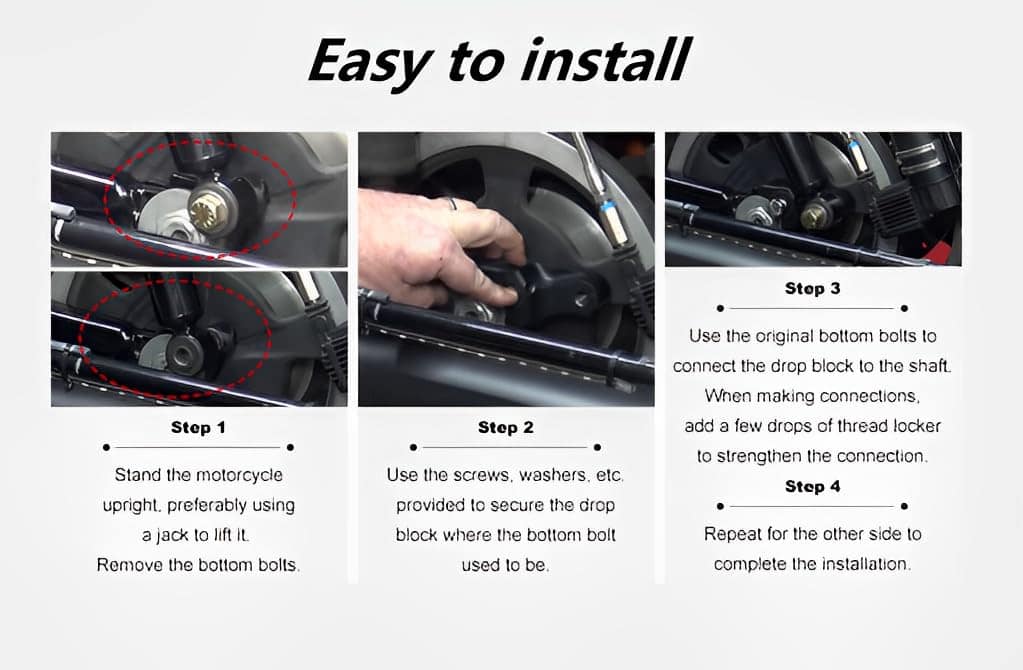 Simplemente se coloca en los agujeros de suspensión existentes con tornillos de fábrica y tornillos suministrados. Nuestros bloques son más gruesos para proporcionar más resistencia que la mayoría en el mercado, duraderos con acabado anodizado negro.