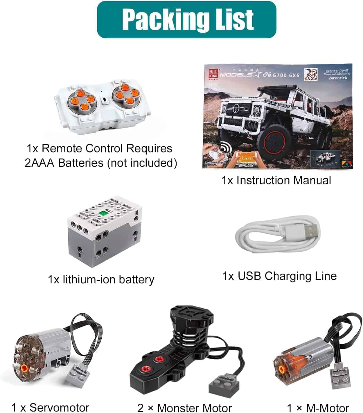 1: Coche modelo a escala 1:8 – Te acerca más que nunca al verdadero SUV G700. Está compuesto por 3686 bloques de construcción y el tamaño completo es de 23 pulgadas (L) x 9.5 pulgadas (W) x 9.0 pulgadas (H). Este es un proyecto de bloques de construcción STEM que inspira las habilidades prácticas de los niños y también es una colección preciada para los entusiastas de los coches. 2: Funciones y Calidad – Este exquisito kit de modelo de coche todoterreno impresiona con una gran atención al detalle y ha sido especialmente desarrollado para los fans de los vehículos todoterreno. Este producto maximiza la restauración del vehículo y admite la apertura de puertas, capó delantero, portón trasero, conducción completa en 360 grados, etc. Los ladrillos están hechos de plástico ABS de alta calidad, con consistencia, compatibilidad, conexión fácil y no fácil de desmontar. 3: APP y Control Remoto – El modelo de coche todoterreno incluye 2 motores gigantes, 1 motor M, 1 motor servo, 1 control remoto y 1 caja de batería de litio. Para el modo de control de la aplicación, solo necesita descargar nuestra aplicación y luego conectarla al teléfono a través de Bluetooth. Luego puedes controlar el coche de bomberos controlado a distancia a través de tu teléfono móvil y disfrutar de todas las manipulaciones placeres. 4: Modelo Ideal – Set de construcción de coche todoterreno también adecuado para niños y niñas de 14 años en adelante. Si estás buscando un modelo genial para tu familia o amigos. Como cumpleaños / Navidad / Año Nuevo / Pascua etc. Este kit de bloques de construcción para coche modelo es una buena elección. 5: Notas – Los productos se prueban rigurosamente antes de salir de fábrica. Si encuentras que faltan piezas u otros problemas, no dudes en contactarnos y te daremos una respuesta satisfactoria.