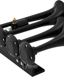Bocina de Aire Cuádruple para Tren (Negro) Construcción de Metal Válvula de Aire Eléctrica de 12V (Solenoide) con Conexión de Compresión Manguera de Plástico de Nylon de » de diámetro (6 pies) Se incluye el Hardware de Montaje Dimensiones: General: 12- » L x 13- » W x 4- » H Trompetas: 13- » L, 11- » L, 9″ L, 7- » L x 3- » D Sistema a Bordo Tanque de Aire de 1 Galón con Compresor de Aire de 150 PSI Presión Máxima: 150 PSI Entrada de Potencia: DC 12V Capacidad del Tanque: 1 Galón Manómetro de Presión de 0-140 PSI Interruptor de Presión 70 ON / 100 OFF PSI Portafusible en Línea Manguera de Aire de 3 pies de longitud Fitting Tipo «L» de » NPT » para Manguera de Aire de 3/8″ Tuerca de Drenaje de Bronce Diseñado para cualquier bocina de aire de alta presión que requiera un sistema de aire a bordo Protección por Sobrecarga Térmica (Se apagará automáticamente cuando el compresor de aire supere los 176F y se reiniciará cuando se enfríe hasta los 158F) Recubrimiento Anticorrosión Montaje de Precisión Se incluye el Hardware de Montaje Dimensiones: 15- » L x 6″ W x 8″ H