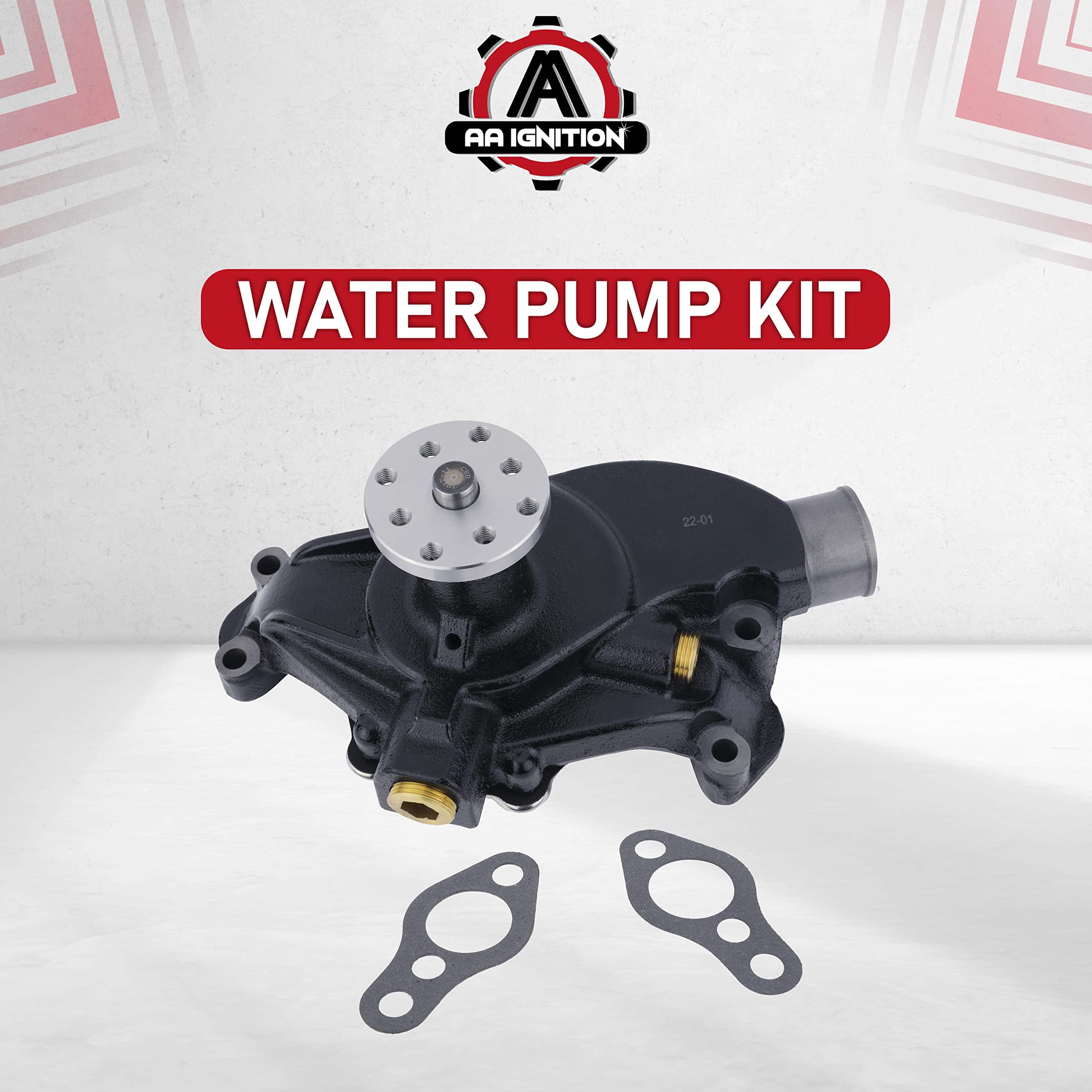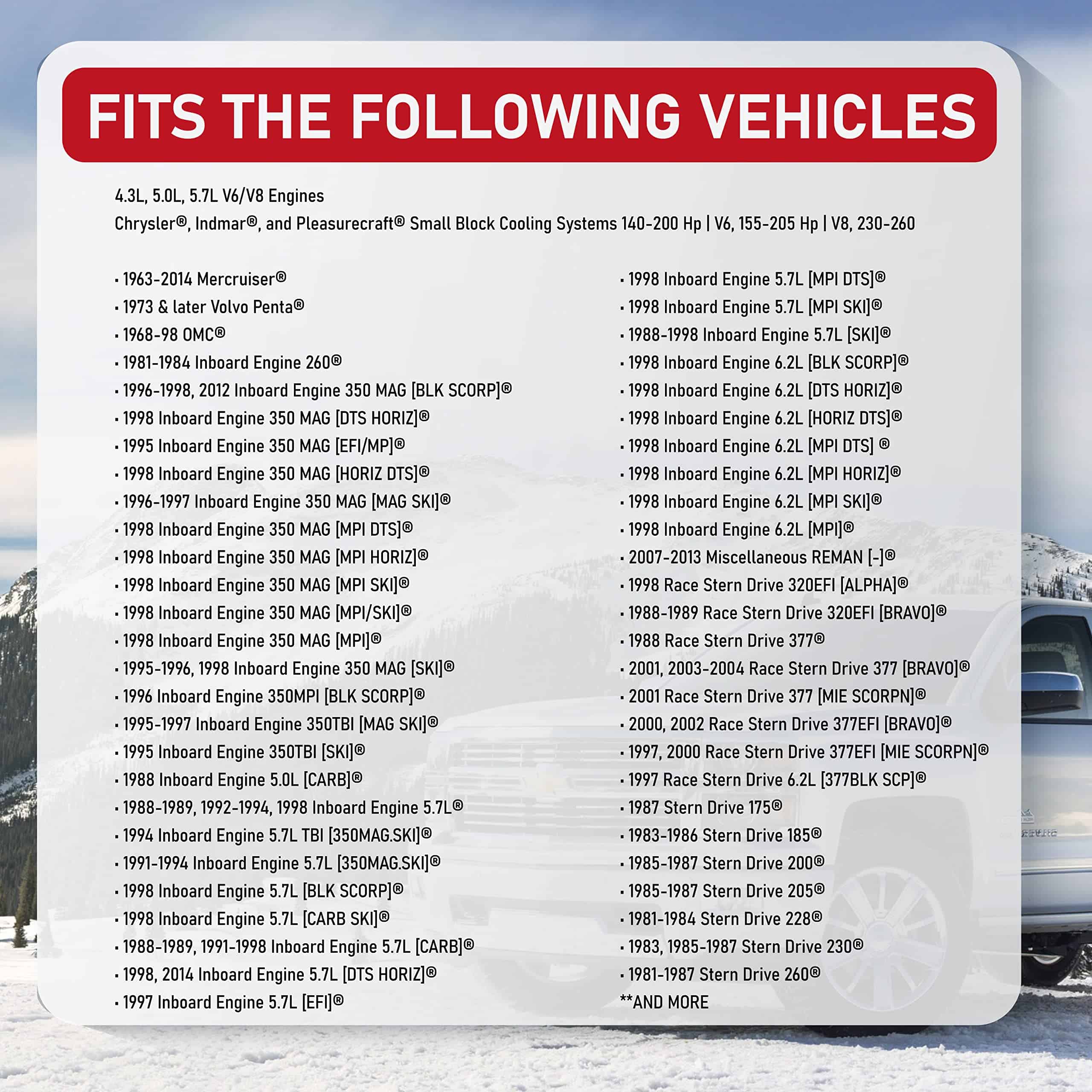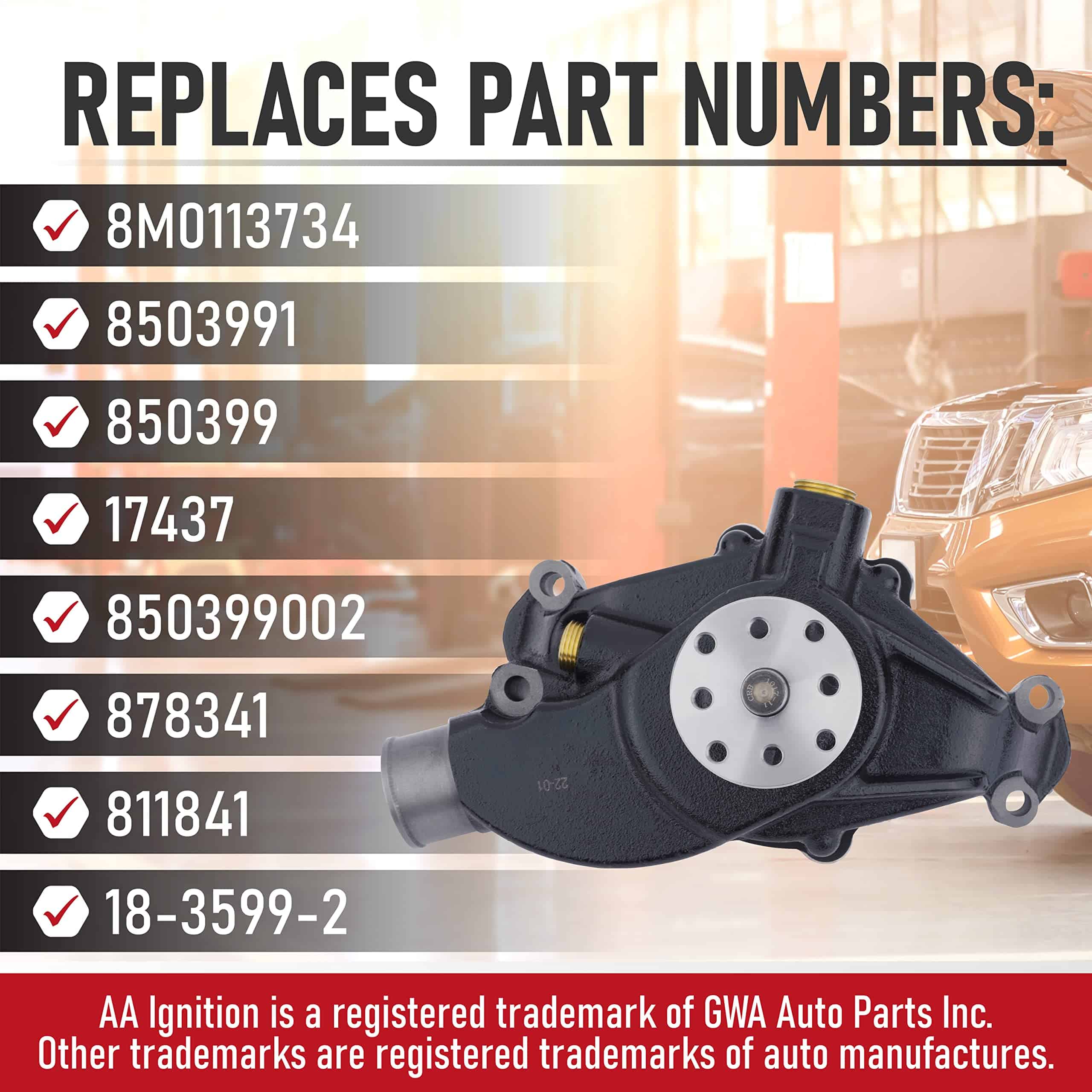 La bomba de agua es una bomba bidireccional impulsada por el motor que circula agua de mar para mantener las temperaturas correctas del motor. Reemplazar la bomba de agua es una medida de seguridad que debe realizarse regularmente cada 75,000-100,000 millas para evitar daños en el motor antes de que falle por completo. Incluye una nueva placa de respaldo de acero inoxidable que proporciona máxima resistencia a la corrosión y durabilidad. Esta bomba de agua es aplicable a cubiertas de cadena de tiempo de acero y compuestas y a todos los motores pequeños de bloque V8. Se encuentra arriba del conjunto de la caja de cambios inferior. Esto NO se adecuará a bombas de agua de motores V6 4.3L de 2007 y posteriores sin un agujero de derivación de agua. Compatible con los siguientes: 1963-2014 Mercruiser 1973 y posteriores Volvo Penta 1968-98 OMC 4.3L, 5.0L, 5.7L V6/V8 Engines Chrysler, Indmar y sistemas de enfriamiento de bloque pequeño Pleasurecraft – 140-200 Hp | V6, 155-205 Hp | V8, 230-260 Hp motores pequeños de bloque GM & MIE. Número de pieza de repuesto: 8M0113734, 8503991, 850399, 17437, 850399002, 878341, 811841, 60658, FI1101292, 54793, 52226, FI1101208, FI1100742, 37951, 35341, 18-3599-2, MW02, WP1500, MC-2-17437, 20318, 15201, S551045, 9-42606, WP453ML, RA057018 Este kit de bomba de agua NO es una pieza genuina, Los modelos de vehículos asociados son marcas registradas de sus respectivos propietarios. Estas marcas comerciales y números de pieza se utilizan en esta lista solo para identificar los vehículos a los que se ajusta este kit de bomba de agua. AA Ignition es una marca registrada de GWA Auto Parts Inc.