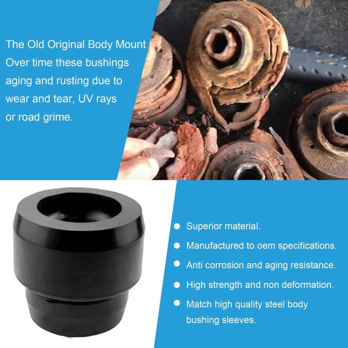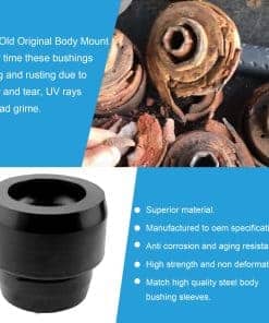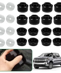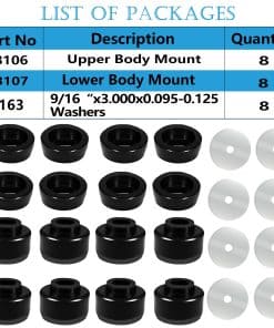 Los montajes de cuerpo y cabina están hechos de poliuretano de alta calidad, con superficie lisa, resistencia a la corrosión y mayor vida útil. Los casquillos y herrajes están fabricados con acero de alta calidad para una instalación fácil y una mejora en la fiabilidad y durabilidad. Estos montajes reemplazan los deteriorados y desgastados bujes de montaje del cuerpo de goma OEM, utilizados para unir el cuerpo y el marco, manteniendo la alineación del cuerpo y del marco, y aislando de manera efectiva la cabina del ruido y la vibración del chasis.