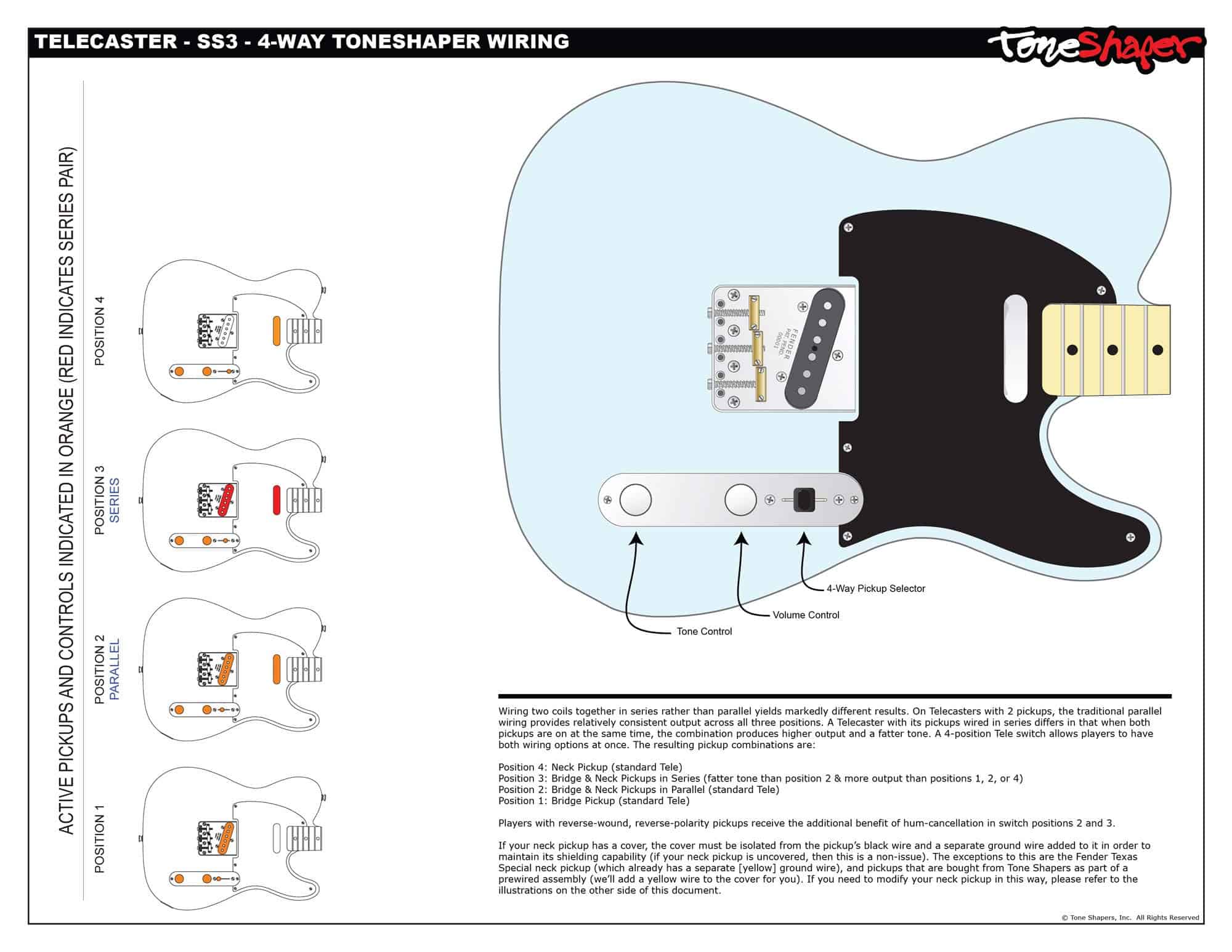 Conectar dos bobinas en serie en lugar de en paralelo produce resultados notablemente diferentes. En Teles con 2 pastillas, el cableado paralelo tradicional proporciona una salida relativamente consistente en las tres posiciones. Pero una Tele con sus pastillas cableadas en serie produce una mayor salida y un tono más grueso. Un interruptor de 4 posiciones permite a los músicos tener ambas opciones de cableado disponibles.