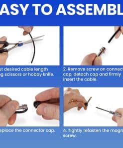 1. FÁCIL DE ENSAMBLAR – Corte rápidamente la longitud de cable deseada con tijeras y conecte los jacks pulgada usando los tornillos magnéticos y destornillador proporcionados. No se requiere pelar el cable.