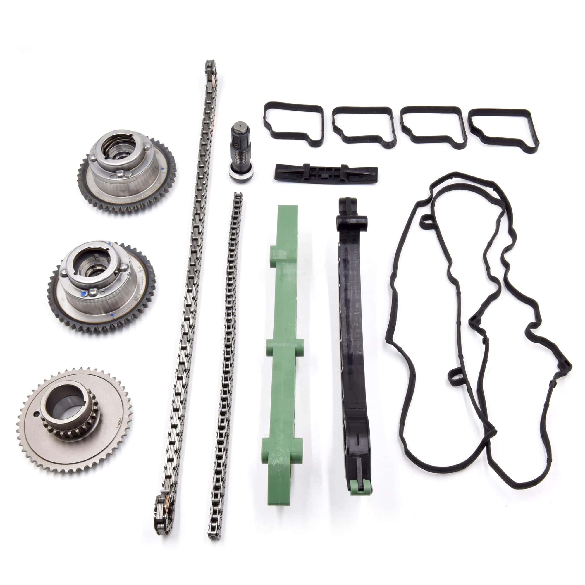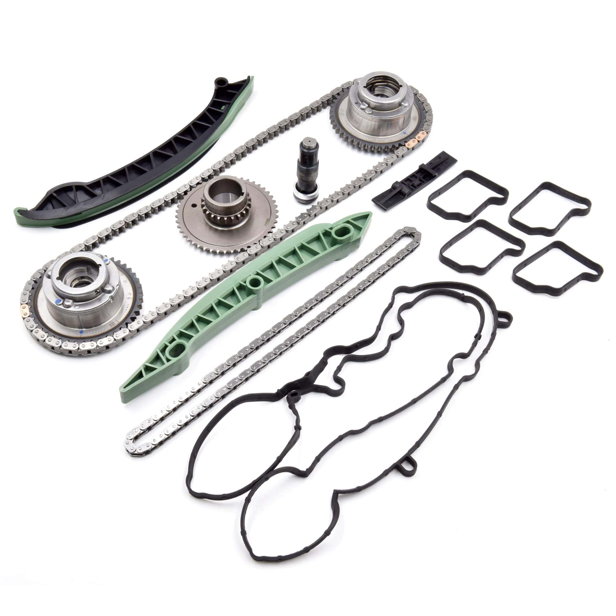 Paquete incluye: 1X Cadena de Tiempo 2X Ajustador del Árbol de Levas 1X Cadena del Eje de Equilibrio 1X Tensor de Cadena de Tiempo 1X Engranaje de Tiempo 3X Guía de Cadena de Tiempo 1X Junta de Tapa de Válvula 4X Juntas de Bujías