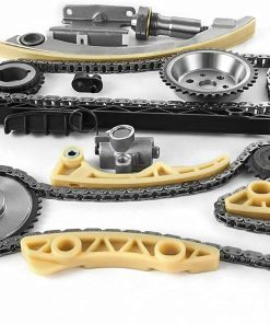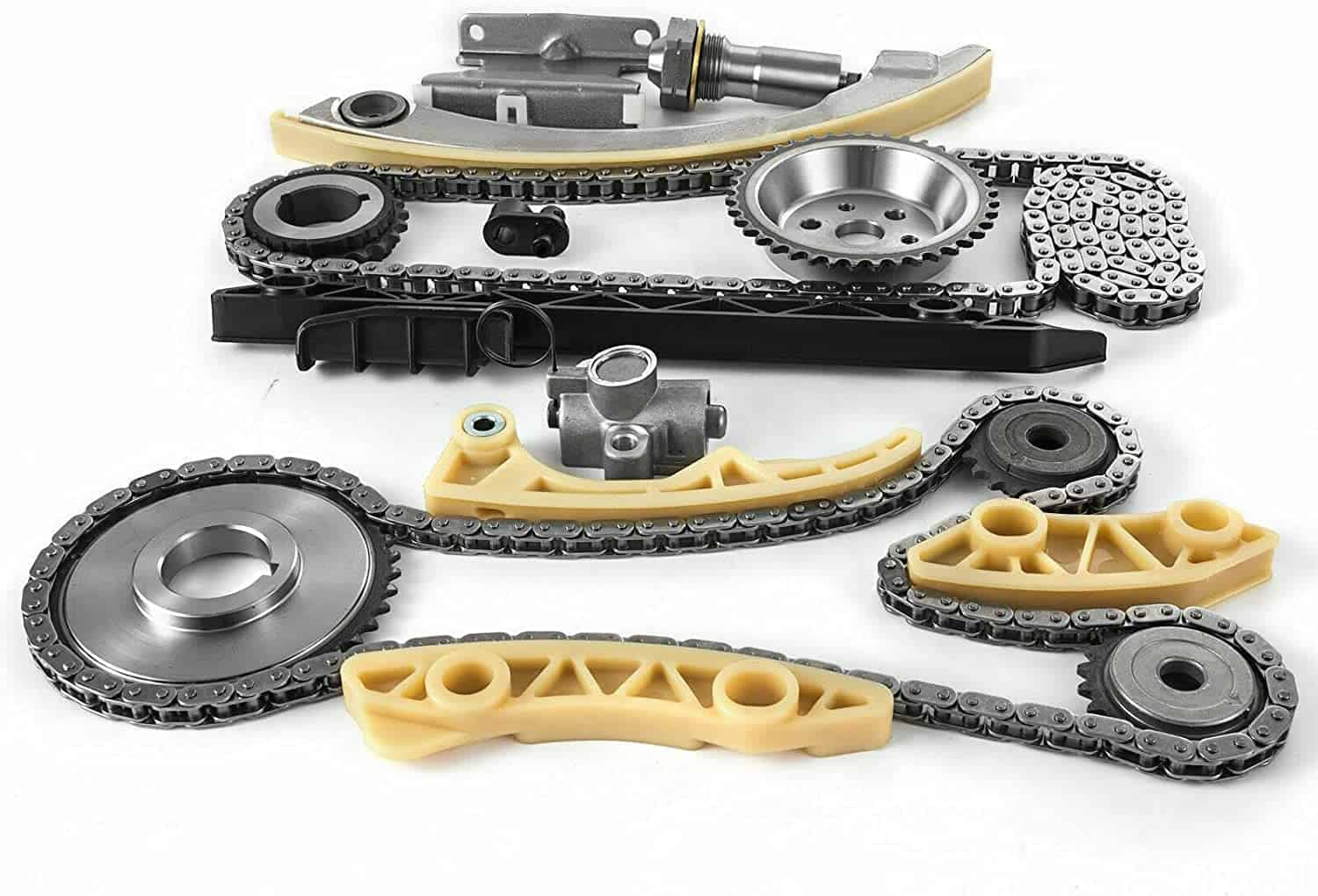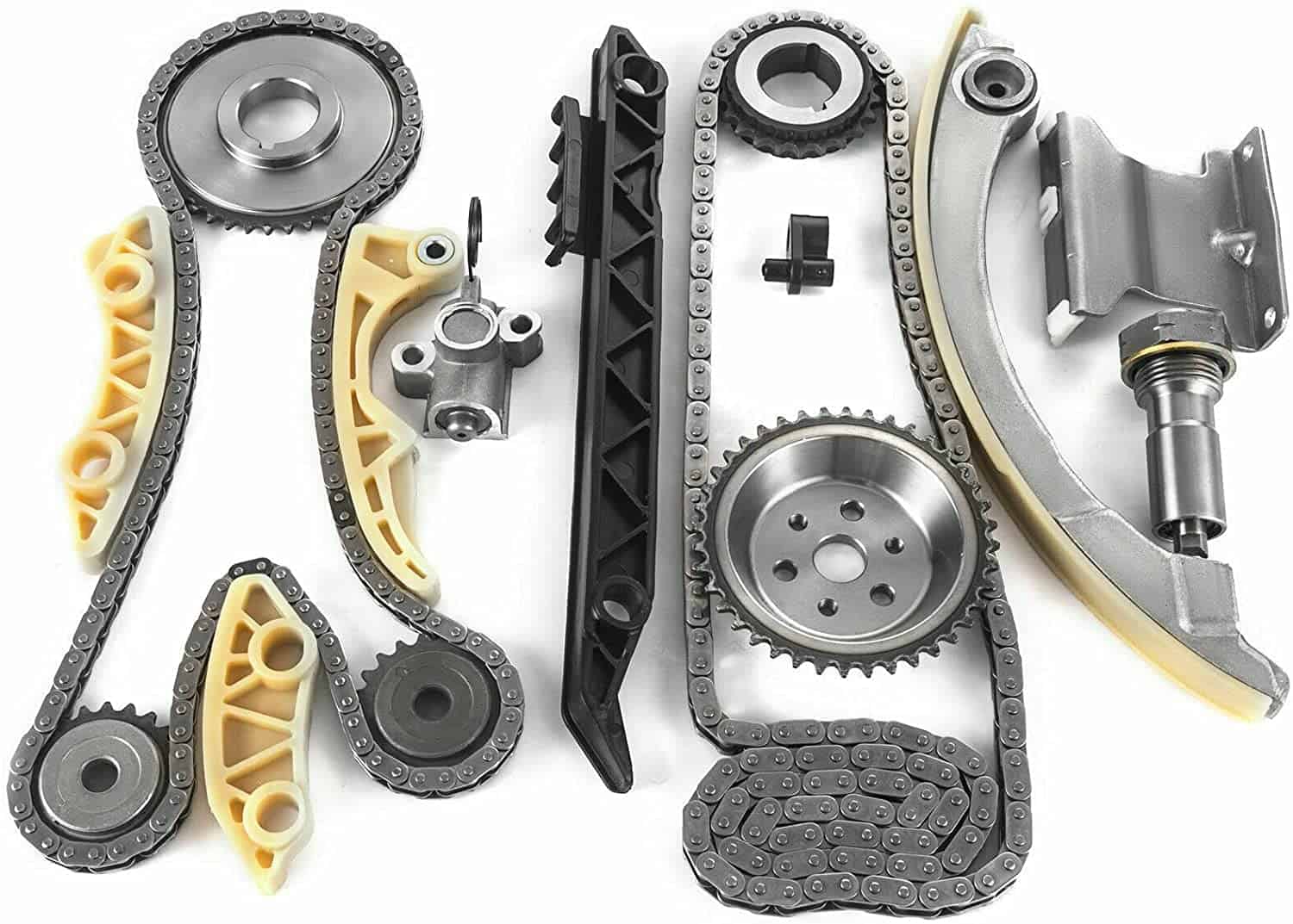 Kit de Cadena de Tiempo compatible con varios modelos de autos Buick, Chevy, GMC, Pontiac, y Saturn. Incluye cadena de tiempo, piñón del cigüeñal, engranaje VVT, rieles de guía, tensor, cadena de tiempo del eje de equilibrio, piñón del cigüeñal del eje de equilibrio, piñones del eje de equilibrio, y rieles de guía del eje de equilibrio.