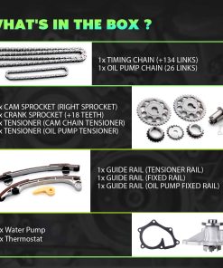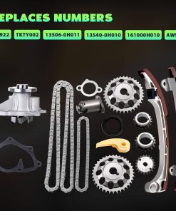 Kit de Cadena de Tiempo del Motor con Bomba de Agua de la marca SCITOO es compatible con varios modelos de Toyota, incluyendo Camry, Corolla, Highlander, Matrix, RAV4 y Solara. Este kit de reemplazo incluye todos los componentes necesarios para completar la reparación, como la cadena de tiempo, cadena de la bomba de aceite, piñones, tensores, rieles guía, piñón de la bomba de aceite y la bomba de agua. Fabricado con materiales de alta calidad, este kit garantiza una transmisión eficiente y estable para el motor de su vehículo. La instalación es sencilla y viene con instrucciones detalladas para una correcta instalación. SCITOO Auto ofrece este kit de Cadena de Tiempo del Motor con Bomba de Agua como una opción confiable para reparar el sistema de distribución de su vehículo. Para confirmar la compatibilidad con su vehículo, por favor seleccione el año, marca, modelo y versión en la esquina superior izquierda de la página o consulte la información del vehículo en la descripción del producto.