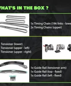 2. Incluye 1x Cadena de tiempo (196 eslabones-Inferior), 2x Cadenas de tiempo (Superior), 1x Guía de cadena de tiempo (Central Superior), 1x Guía de cadena de tiempo (Izquierda), 1x Brazo tensor de cadena de tiempo (Derecho, Primario), 1x Tensor de cadena de tiempo (Izquierdo Superior), 1x Tensor de cadena de tiempo (Derecho Superior), 1x Tensor de cadena de tiempo (Derecho, Primario).