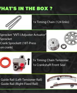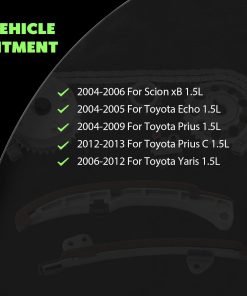 Kit de Cadena de Tiempo del Motor SCITOO – TK2000-VVT, TK2000, TK2000-VVT, 13523-0D010, 13506-21050, 13540-21020, 13561-21040, 13559-21030, TK2045. Este kit de cadena de tiempo del motor es compatible con diversos vehículos Toyota y Scion, como el Scion xA 1.5L, Scion xB 1.5L, Toyota Echo 1.5L, Toyota Prius 1.5L y Toyota Yaris 1.5L. Incluye una cadena de tiempo de 124 eslabones, un tensor de cadena de tiempo, rieles guía y varios piñones necesarios para la instalación. La nueva actualización de este kit garantiza la máxima calidad y durabilidad, reduciendo así los costos de mantenimiento a largo plazo. Fácil de instalar y diseñado para un rendimiento óptimo en su motor. Si tiene alguna pregunta sobre este producto, no dude en ponerse en contacto con nuestro equipo de atención al cliente para obtener asistencia inmediata.