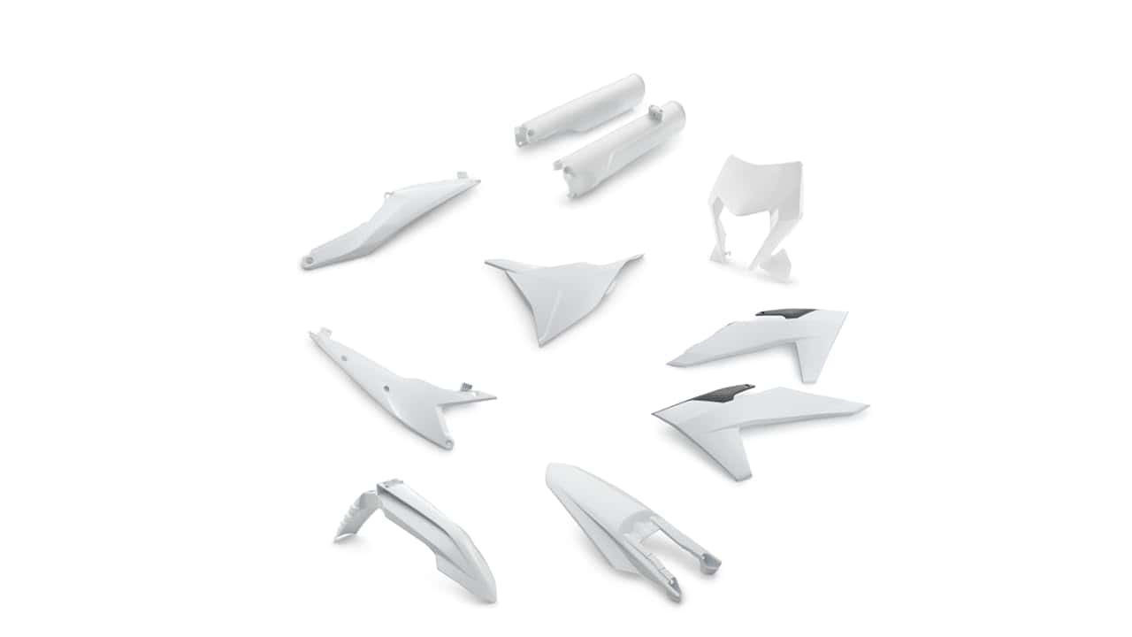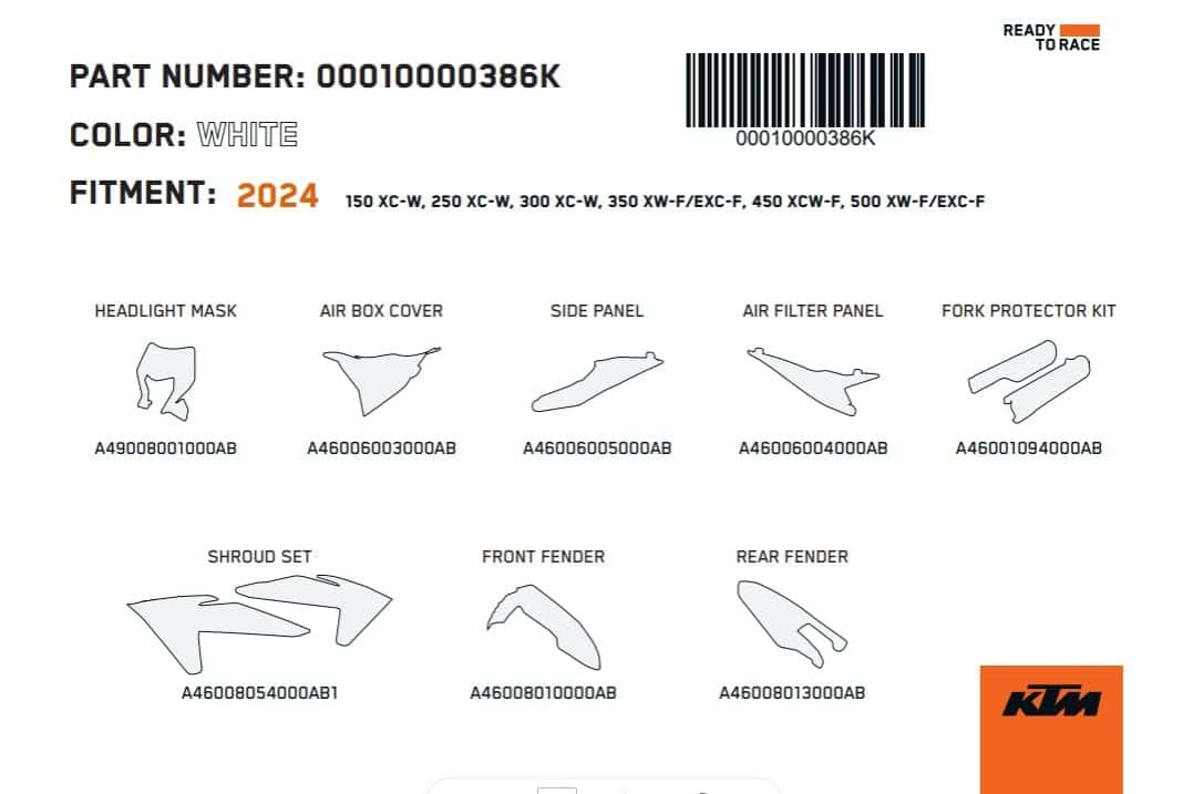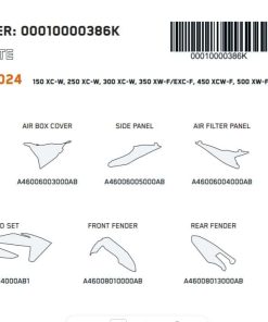 Piezas originales de carenado, sin la decoración estándar. Base óptima para crear un diseño único. Ajuste perfecto. Personaliza el aspecto de tu motocicleta. Kit contiene: Juego de protector de horquilla, Guardabarros, Cubierta de filtro de aire, Panel de filtro de aire, Carenado lateral, Cubierta del faro, Juego de spoiler, Sección trasera. Todas las piezas empaquetadas en una caja. Se adapta a 150-500 XC-W, XW-F, XCF-W, EXC-F 24