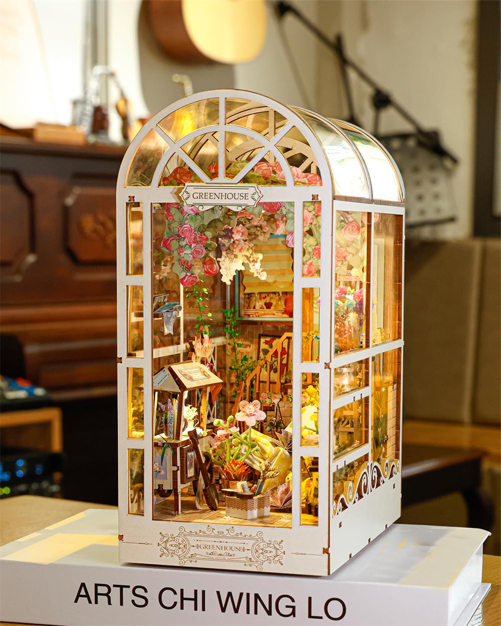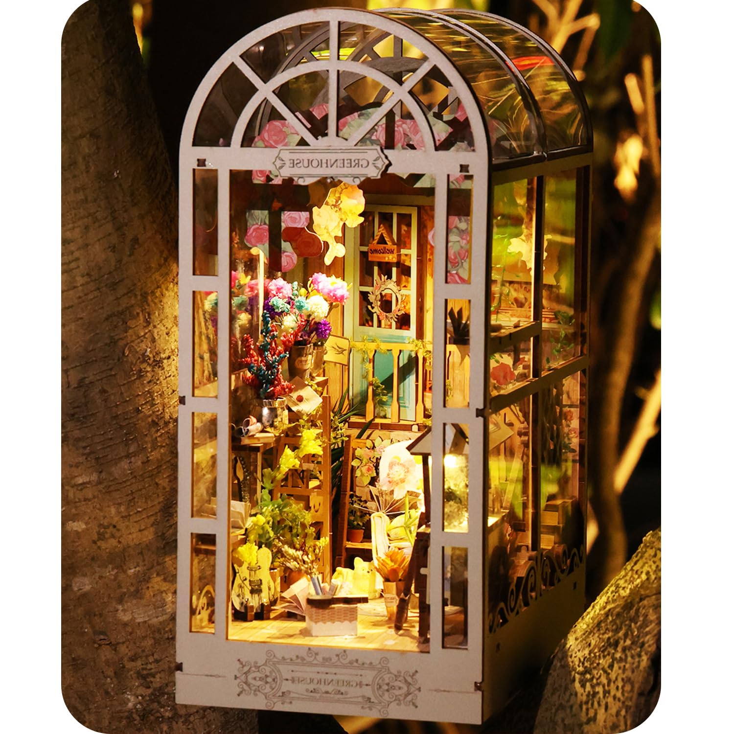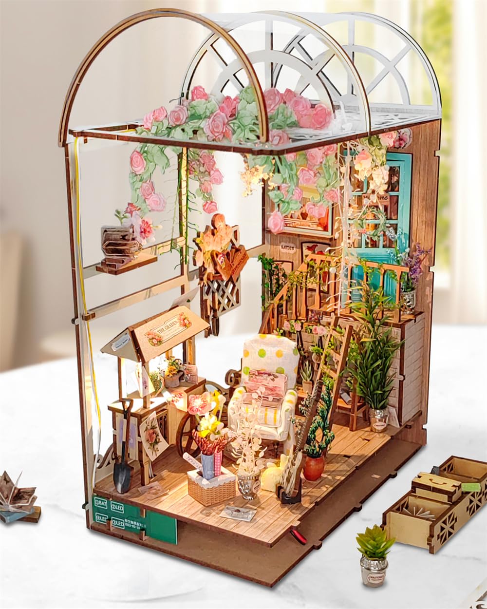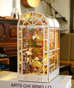 1. YuanWood GreenHouse Adéntrate en la elegancia de una casa de jardín con una escalera curva, ventanas abatibles y hermosas enredaderas de glicina en este kit de rincón de libro. Abraza los detalles exquisitos y la ambientación, experimentando el poder curativo de un mundo en miniatura.