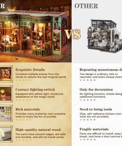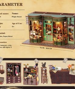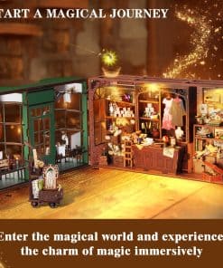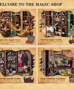 Este kit de construcción en miniatura combina múltiples escenas clásicas y elementos de la película, como una puerta de tienda que se puede empujar abrir/cerrar, un antiguo letrero de madera, estantes llenos de varitas mágicas, una escoba mágica. Los detalles realistas te hacen sentir como un mago y sentir el verdadero mundo mágico.