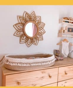 ELEGANTE Y CLÁSICO: nuestra estación de cesta cambiadora de bebés con diseños de cestas Boho para la guardería de bebés y delicada impresión de flores en la cubierta. Como agradecimiento por confiar en nosotros con nuestra cesta cambiadora de pañales para cómoda del bebé, también incluiremos una bolsa ecológica de 100% algodón para tu cesta. Flecos de macramé alrededor de los bordes y un aspecto natural de cesta cambiadora Boho para bebés se verán elegantes en cualquier habitación de la casa con este mobiliario para bebés.