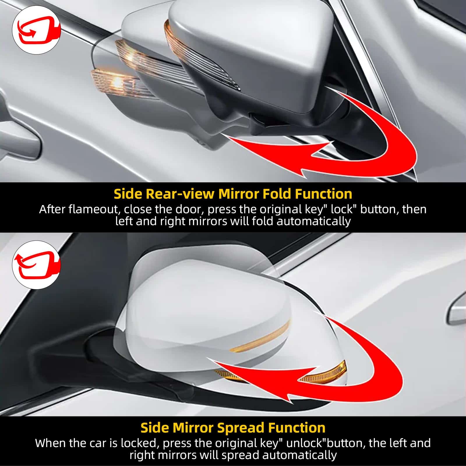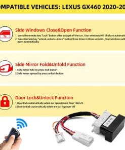 Kit de cierre automático de ventanas para auto OBD y espejos laterales plegables para Lexus GX GX400 GX460 2020-2022 con volante a la izquierda. Este modelo ofrece 6 funciones principales: cierre de ventanas al cerrar las puertas, apertura de ventanas con control remoto, plegado y despliegue de espejos laterales, bloqueo automático de puertas al superar los 10 km/h, y desbloqueo automático al apagar el auto. Instalación fácil y rápida, con instrucciones y video incluidos. Atención: solo compatible con conducción a la izquierda.
