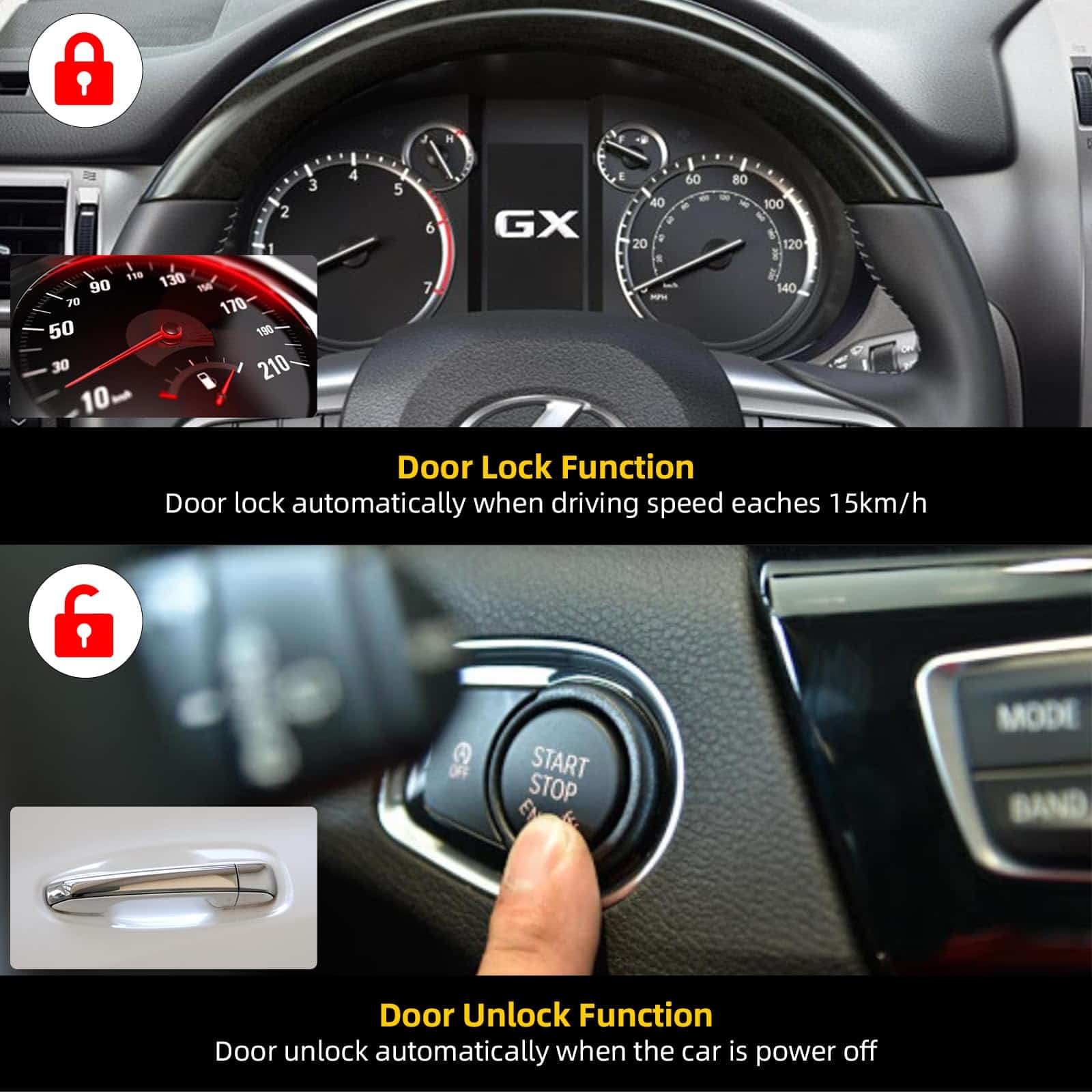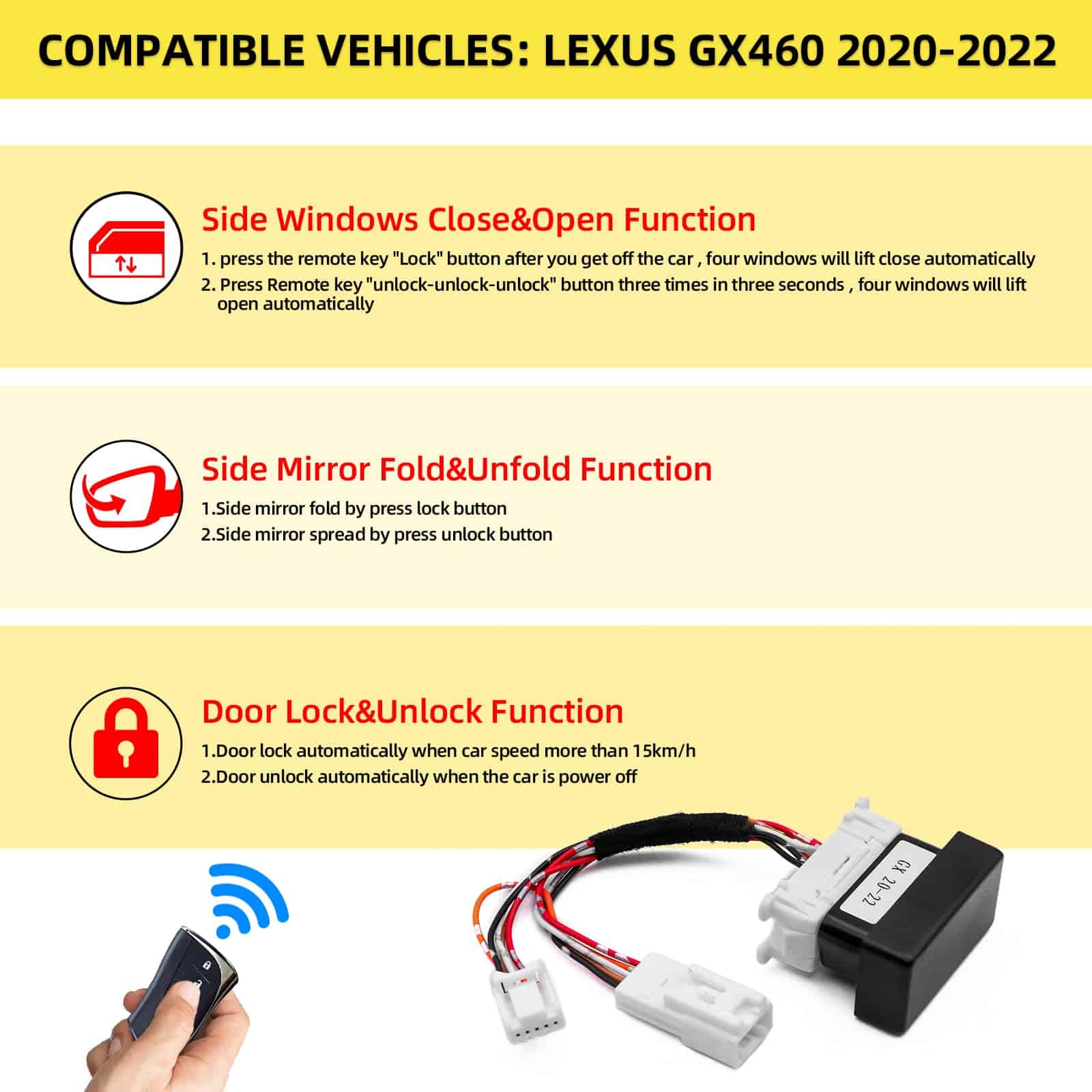 Compatible con vehículos Lexus GX GX460 2020 2021 2022. Funciones de cierre y apertura de ventanas, plegado y despliegue de espejos laterales, y bloqueo automático de puertas.