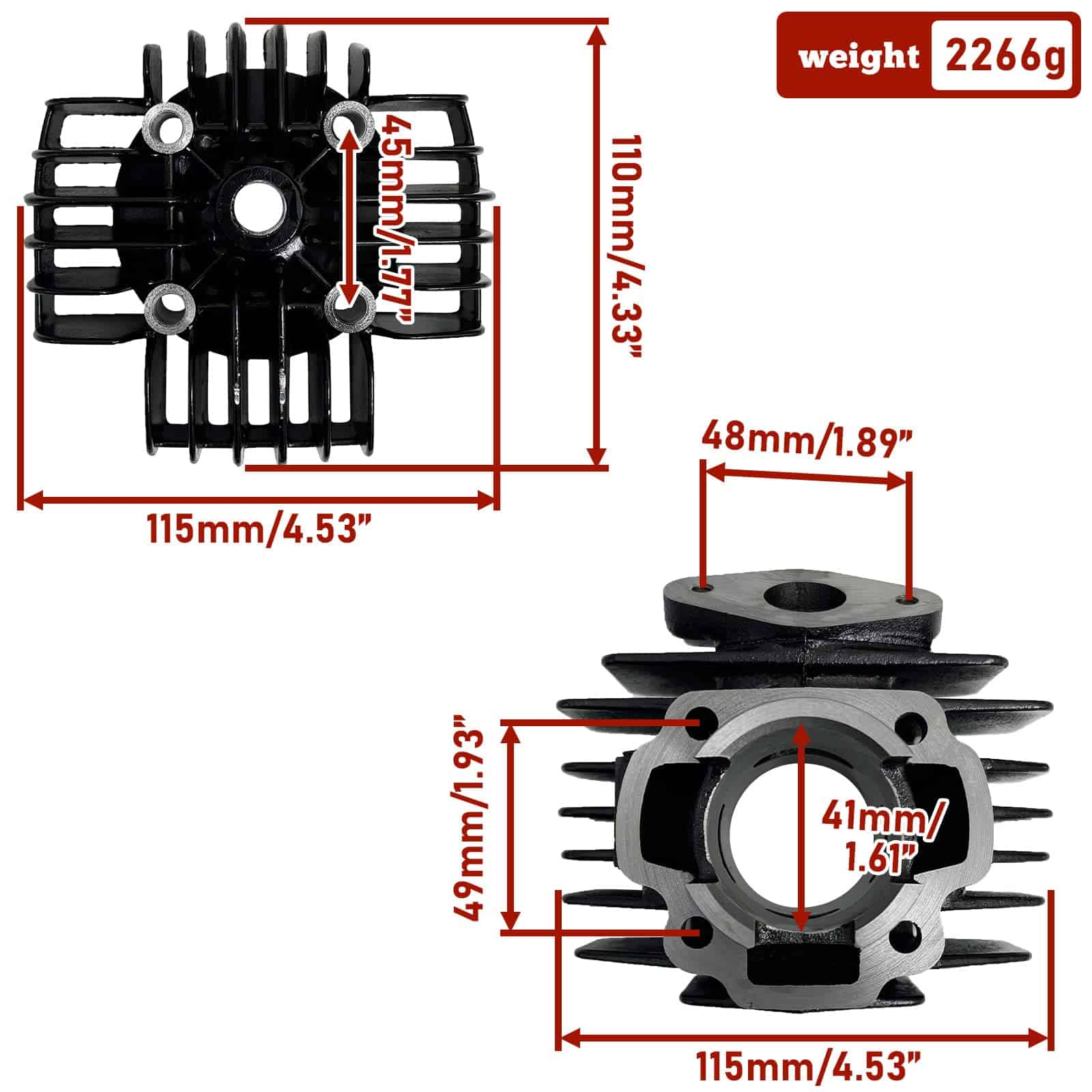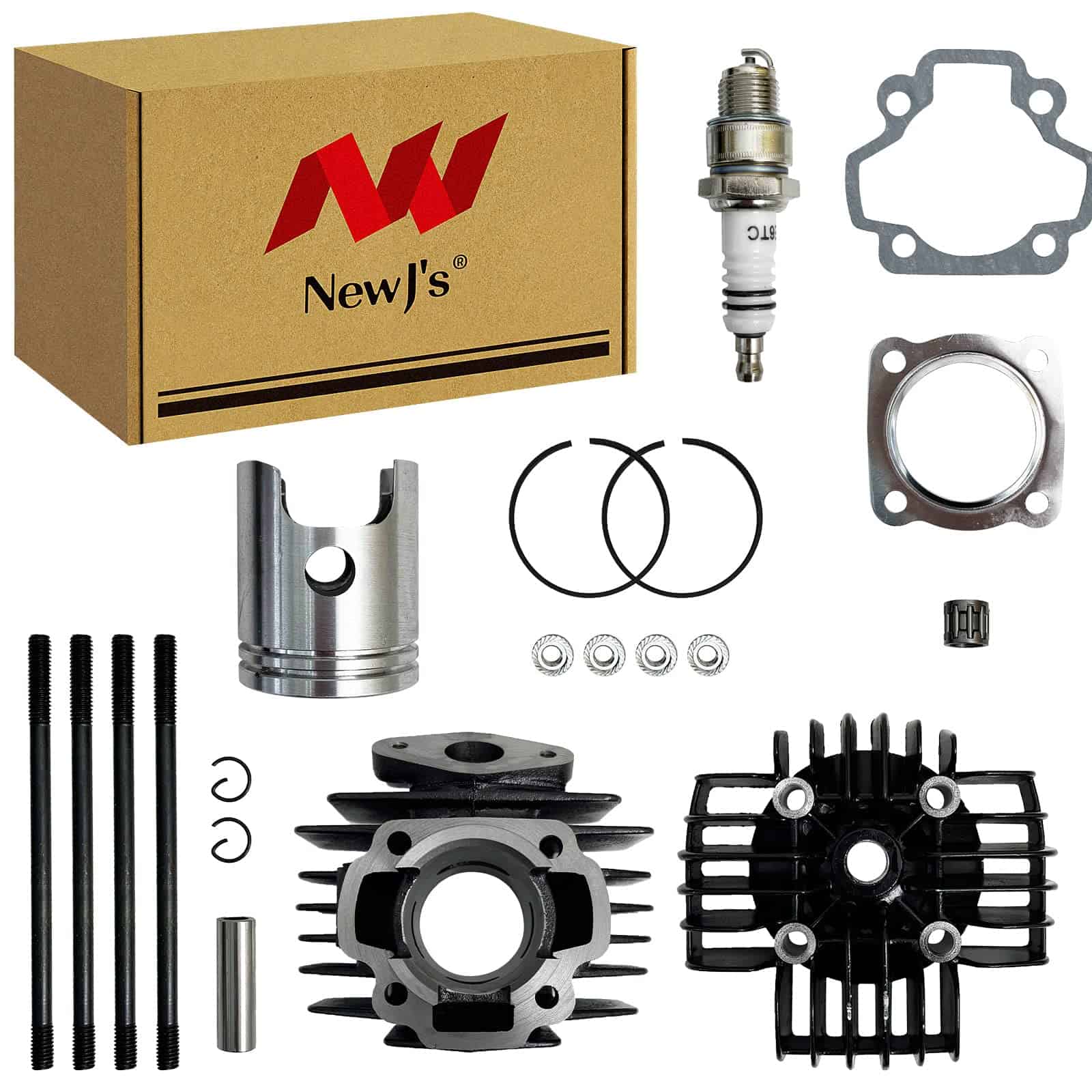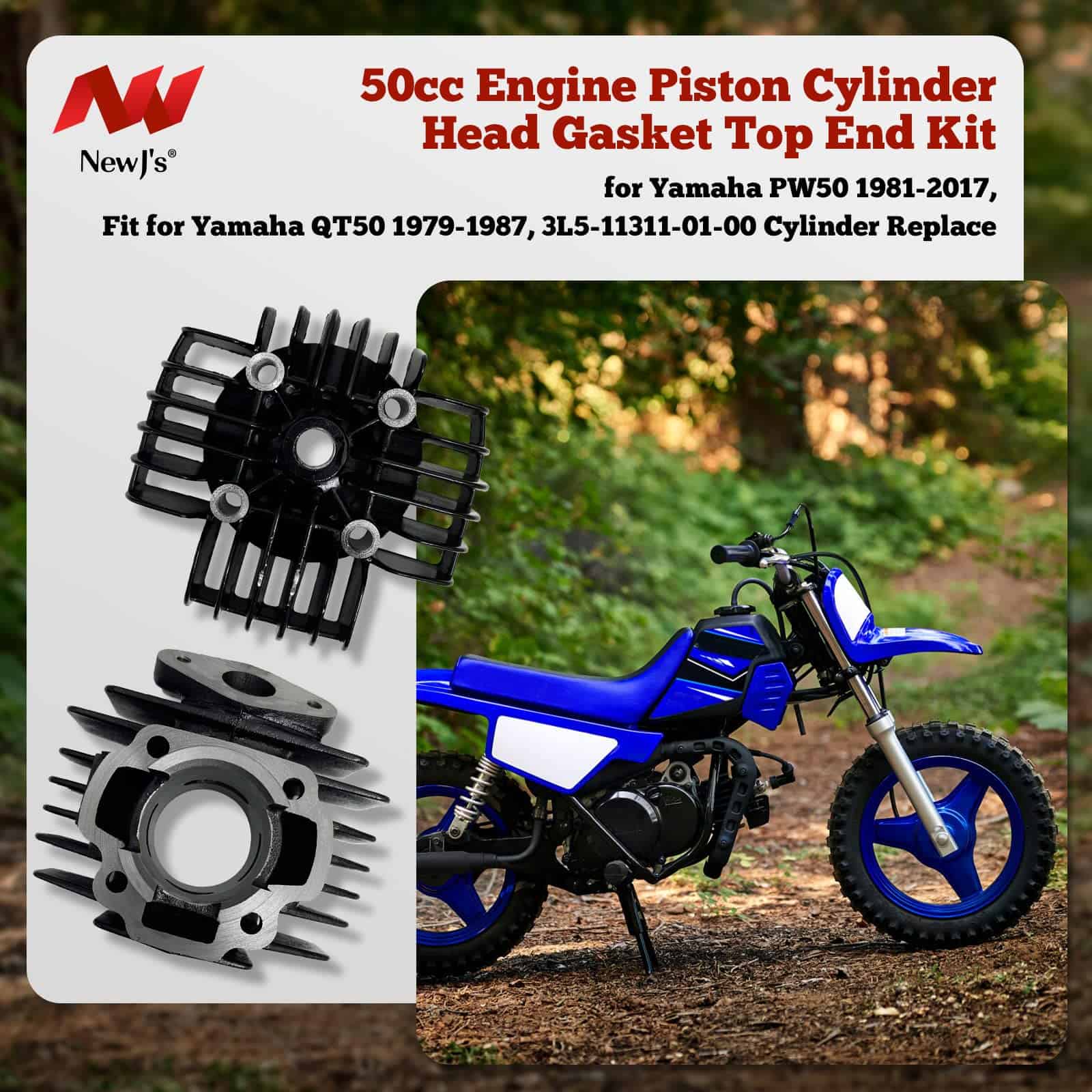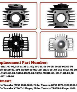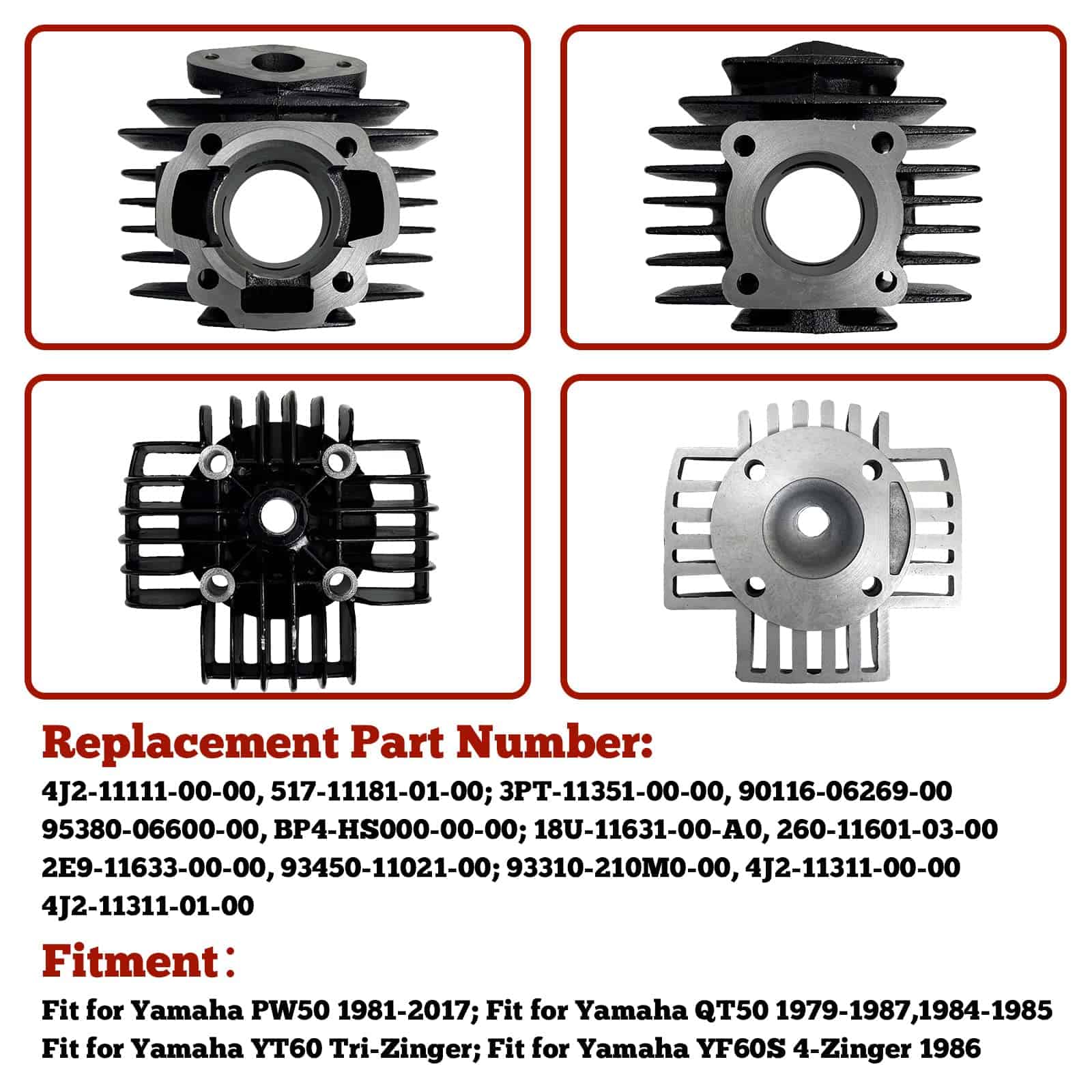 Compatibilidad: para Yamaha PW50 1981-2018. Números de parte: 4J2-11111-00-00, 517-11181-01-00, 3PT-11351-00-00, 90116-06269-00, 95380-06600-00, BP4-HS000-00-00, 18U-11631-00-A0, 260-11601-03-00, 2E9-11633-00-00, 93450-11021-00, 93310-210M0-00, 4J2-11311-00-00, 4J2-11311-01-00. Lista de paquetes: 1 x Cilindro, 1 x Culata, 1 x Pistón, 1 x Anillos de Pistón, 1 x Pasador de Piston, 2 x Clips, 1 x Junta de Culata, 1 x Junta de Base, 4 x Espárragos de Cilindro, 4 x Tuercas de Espárragos de Cilindro, 1 x Bujía.