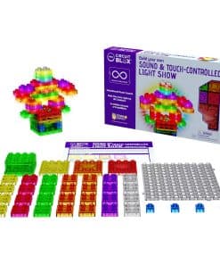 E-BLOX CREA TU PROPIO ESPECTÁCULO DE LUZ CONTROLADO POR SONIDO Y TACTO – Este kit de E-Blox viene con 28 módulos LED en diferentes colores. ¡Deja volar tu imaginación construyendo estructuras de luz en 3D que se pueden controlar para atenuarse y reaccionar a tu voz o música. Coloca los módulos de controlador, activación de voz y placa LED en el módulo de batería, luego usa piezas LED para construir tus estructuras de luz. ¡Utiliza el controlador para seleccionar qué tan rápido se atenúan las luces y establece las luces en modo de activación por sonido! Compatible con nuestras líneas Circuit Blox y Power Blox, LEGO y otras marcas de bloques principales. Diseñado para estimular la creatividad y enseñar a los niños a investigar el mundo a través del razonamiento creativo y la construcción sistemática de objetos. Los niños podrán innovar mientras ensamblan ladrillos y módulos para crear sus propios juguetes y juegos. El kit de E-Blox Crea tu Propio Espectáculo de Luz Controlado por Sonido y Tacto es adecuado para niños de 5 años en adelante. Manual incluido para guiar a tus hijos en la construcción de sus propias obras maestras de forma segura. Requiere tres baterías AA (no incluidas). EL KIT BRINDA horas de diversión y juego educativo. Los coloridos bloques de construcción contienen componentes electrónicos como un módulo de batería, LEDs, módulo de activación de sonido, módulo de controlador y placa LED. Y con espaciadores transparentes adicionales, puedes construir estructuras geniales que se atenúan y se encienden, se iluminan con tu voz o bailan al ritmo de sonidos y música.