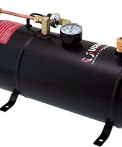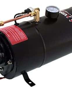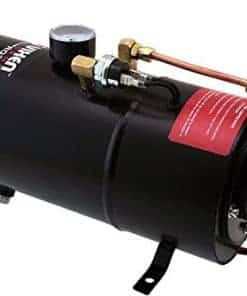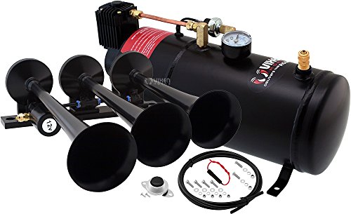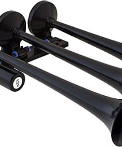Claxon de Aire Triple Trompeta de Tren (Negro) Construcción de Metal Válvula de Aire Eléctrica de 12V (Solenoid) con Conexión de Compresión Manguera de Plástico de Nilon de » OD (6 Pies) Hardware de Montaje Incluido Dimensiones: en General: 15- » L x 11″ W x 4- » H Trompetas: 15″ L, 13- » L, 12″ L x 3″ D Sistema a Bordo Tanque de Aire de 1 Galón con Compresor de Aire de 150 PSI Presión Máxima: 150 PSI Entrada de Energía: CC 12V Capacidad del Tanque: 1 Galón Medidor de Presión 0-140 PSI Interruptor de Presión 70 ON / 100 OFF PSI Soporte para Fusible en Línea de 30A Manguera de Plástico de Nilon de » OD (6 Pies) Botón de Claxon Tuerca de Drenaje de Latón Diseñado para cualquier claxon de aire de alta presión que requiera un sistema de aire a bordo Protección de Sobrecarga Térmica (Se apagará automáticamente cuando el compresor de aire alcance más de 176 F y se reiniciará cuando se enfríe a 158 F) Recubrimiento Anticorrosión Montaje de Precisión Hardware de Montaje Incluido Dimensiones: 15- » L x 6″ W x 8″ H