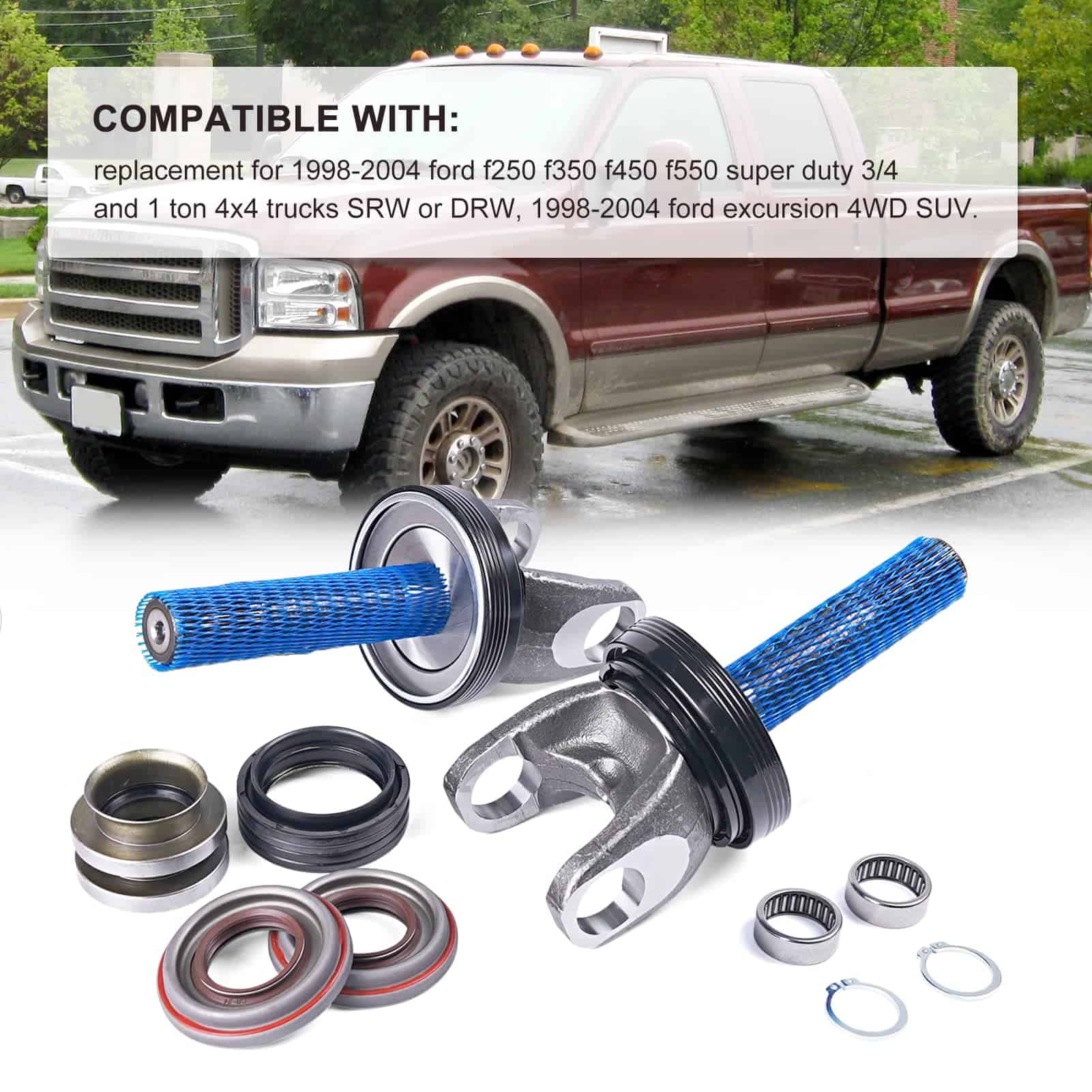 Kit de cojinete y sello de junta Universal de eje de eje frontal externo 550759 2002692 Fits para 1998-2004 Ford F250 F350 Excursion Super Duty Para DANA 50/60 Eje de eje frontal externo/Master Seal Kit REEMPLAZA EL NÚMERO DE PARTE: SPL55-3X, 550759, 50491, 50381, 41784-2, 700238-2X, 700238-1X, 550759, 2002692, 47750, 5-806X, 5-732X. COMPATIBLE CON: Reemplazo de cojinete de eje delantero 2002692 para vehículos Ford f250 f350 f450 f550 super duty, 1998-2004 ford excursion 4WD SUV. Nota Con un eje frontal Dana 50/60 y suspensión de resorte helicoidal. Este eje solo se utilizó en ejes delanteros con suspensión estándar de resorte de hojas. El eje exterior se ajusta tanto al lado del conductor como al del pasajero. El eje delantero externo mide 9.38 pulgadas de largo, 30 estrías, 1.31 pulgadas de diámetro de estría. Les pedimos disculpas de antemano. Nuestros productos son probados para calidad antes de ser vendidos. Sin embargo, las piezas de automóviles a menudo chocan durante el transporte de larga duración, lo que resulta en algunas partes dañadas y el producto no funciona o se daña después de una o dos semanas de uso. Esto generalmente no es un problema de calidad del producto, y no tiene que preocuparse, ofrecemos un y servicio postventa, puede ponerse en contacto con nosotros, le ayudaremos a recuperar la pérdida. Si el producto que recibe no cumple con sus necesidades, también puede ponerse en contacto con nosotros y le ayudaremos a resolver su problema.