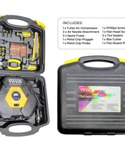 Las emergencias pueden ocurrir en la carretera en un instante, y necesitas estar preparado para manejar cualquier eventualidad. El Kit de Compresor de Neumáticos y Seguridad VViViD es la herramienta perfecta para sacarte de tu emergencia en la carretera. Este kit incluye todo lo que necesitas para parchar una perforación en tu neumático. En el centro de este kit está el Compresor de 12 voltios para volver a inflar tus neumáticos, aunque con los múltiples accesorios también puedes usarlo para inflar colchones de aire, pelotas deportivas e incluso juguetes acuáticos. Incluido en este kit hay una herramienta de raspado de acero, para limpiar el borde de las perforaciones, una herramienta de aguja de ojo dividido para insertar la cuerda de reparación de goma en la perforación y un cuchillo multiusos para recortar el exceso de cuerda de parcheado. Este kit es altamente compacto y se adapta fácilmente en cualquier lugar de tu automóvil. Enfrenta cualquier tarea con VViViD. Ten en cuenta: No apto para usar en perforaciones mayores de 1/4 o en perforaciones en la pared lateral del neumático.