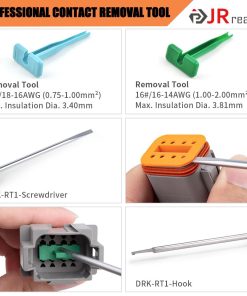 JRready ST6309 Deutsch Connector Kit 416PCS – 2 3 4 6 8 12 Pin DT Connectors with Size 16 Solid Contacts(14-20AWG), Waterproof Automotive Electrical Connector for Car, Motorcycles, Boat. Configurations include 32 sets 2, 3, 4, 6, 8, 12 pin connectors, 132 pairs size 16 solid contact, 4 pcs deutsch pin removal tool, 20 pcs seal retention plug. PA66 Material DT connectors are made of PA66 material, rugged thermoplastic housings operate in temperatures from -40 C to 125 C. Can protect your electrical system from dirt, dust, mud, water, vibration and rough terrain. Application Deutsch connectors are currently the most popular connectors in car, boat, motorcycles or pickup truck (Ford F-150) wiring applications. It has excellent performance in the connection of offroad LED light, driving lights and boat lights. Multifunctional Contact Extraction Tool DRK-RT1 and contact removal tools are the safest way to remove internal contacts without damage to the terminals, housing, or wires. Usage where the tool can save countless hours of labor. Size 16 Solid Contact Made of phosphorus bronze material, it has better high-temperature and corrosion resistance than brass, and has undergone annealing heat treatment process to improve contact ductility and wider crimping range(14-20AWG).