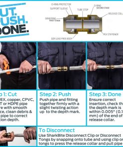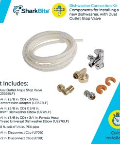 Simplifique sus proyectos de fontanería con el kit de conexión de lavavajillas SharkBite. Este kit de instalación tiene todos los elementos necesarios para instalar su nuevo lavavajillas. Este kit intuitivo incluye (1) Válvula de Cierre de Ángulo de Salida Doble, (1) Adaptador de Compresión de 1/4 pulgada (OD de 3/8 pulgadas) x 3/8 pulgada, (1) Codo de Lavavajillas MNPT de 1/4 pulgada (OD de 3/8 pulgadas) x 3/8 pulgada, (1) Codo Universal de Rosca de Manguera Hembra de 1/4 pulgada (OD de 3/8 pulgadas) x 3/4 pulgada, (1) Bobina de 10 pies de tubería PEX de 1/4 de pulgada, (1) Clip de Desconexión de 1/4 de pulgada y (1) Clip de Desconexión de 1/2 pulgada. Este kit de conexión es ideal para trabajar en espacios reducidos y se puede instalar en líneas húmedas. Estas inclusiones son fáciles de instalar, compatibles con tuberías de PEX, cobre, CPVC, HDPE y PE-RT, y no requieren herramientas especiales, pegamento, engarces o soldaduras para la instalación. Las herramientas y accesorios SharkBite cumplen con los mismos estándares elevados para aplicaciones de fontanería comercial y residencial, combinando durabilidad y facilidad de uso. Este kit de instalación de fontanería puede soportar 200 grados F y 200 PSI.