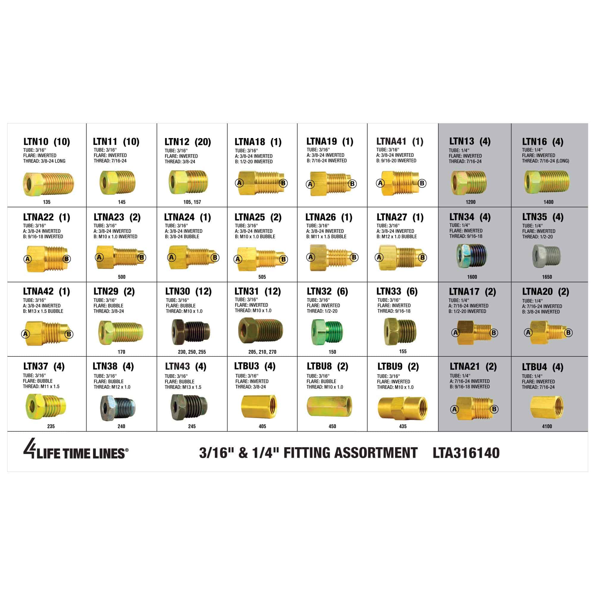 (10) LTN10 Tubo: 3/16 Flare: Rosca invertida: 3/8-24 Largo (10) LTN11 Tubo: 3/16 Flare: Rosca invertida: 7/16-24 (20) LTN12 Tubo: 3/16 Flare: Rosca invertida: 3/8-24 (1) LTNA18 Tubo: 3/16 A: 3/8-24 Invertida B: 1/2-20 Invertida (1) LTNA19 Tubo: 3/16 A: 3/8-24 Invertida B: 7/16-24 Invertida (1) LTNA41 Tubo: 3/16 A: 3/8-24 Invertida B: 9/16-20 Invertida (4) LTN13 Tubo: 1/4 Flare: Rosca invertida: 7/16-24 (4) LTN16 Tubo: 1/4 Flare: Rosca invertida: 7/16-24 Largo (1) LTNA22 Tubo: 3/16 A: 3/8-24 Invertida B: 9/16-18 Invertida (2) LTNA23 Tubo: 3/16 A: 3/8-24 Invertida B: M10 x 1.0 Invertida (1) LTNA24 Tubo: 3/16 A: 3/8-24 Invertida B: 3/8-24 Burbuja (2) LTNA25 Tubo: 3/16 A: 3/8-24 Invertida B: M10 x 1.0 Burbuja (1) LTNA26 Tubo: 3/16 A: 3/8-24 Invertida B: M11 x 1.5 Burbuja (1) LTNA27 Tubo: 3/16 A: 3/8-24 Invertida B: M12 x 1.0 Burbuja (4) LTN34 Tubo: 1/4″ Flare: Rosca invertida: 9/16-18 (4) LTN35 Tubo: 1/4″ Flare: Rosca invertida: 1/2-20 (1) LTNA42 Tubo: 3/16 A: 3/8-24 Invertida B: M13 x 1.5 Burbuja (2) LTN29 Tubo: 3/16 Flare: Burbuja Rosca: 3/8-24 (12) LTN30 Tubo: 3/16 Flare: Burbuja Rosca: M10 x 1.0 (6) LTN32 Tubo: 3/16 Flare: Rosca invertida: 1/2-20 (6) LTN33 Tubo: 3/16 Flare: Rosca invertida: 9/16-18 (2) LTNA17 Tubo: 1/4″ A: 7/16-24 Invertida B: 1/2-20 Invertida (2) LTNA20 Tubo: 1/4″ A: 7/16-24 Invertida B: 3/8-24 Invertida (4) LTN37 Tubo: 3/16 Flare: Burbuja Rosca: M11 x 1.5 (4) LTN38 Tubo: 3/16 Flare: Burbuja Rosca: M12 x 1.0 (4) LTN43 Tubo: 3/16 Flare: Burbuja Rosca: M13 x 1.5 (4) LTBU3 Tubo: 3/16 Flare: Rosca invertida: 3/8-24 (2) LTBU8 Tubo: 3/16 Flare: Burbuja Rosca: M10 x 1.0 (2) LTBU9 Tubo: 3/16 Flare: Rosca invertida: M10 x 1.0 (2) LTNA21 Tubo: 1/4″ A: 7/16-24 Invertida B: 9/16-18 Invertida (4) LTBU4 Tubo: 1/4″ Flare: Rosca invertida: 7/16-24