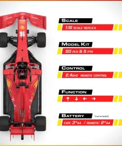 Kit de construcción de automóvil Ferrari F1 SF1000 con control remoto de Voltz Toys, modelo con licencia, escala 1/16, juego de ensamblaje de supercoche con control remoto, 65 piezas, kits STEM para niños y adultos, a partir de 8 años. ¡Construye tu propio supercoche con control remoto! Modelo oficialmente licenciado Ferrari F1 SF1000, este kit de construcción de automóvil RC F1 a escala 1:16 deleitará y entretendrá a adultos y niños en casa. Con este kit de bricolaje, los niños pueden crear sus propios coches teledirigidos y correr con ellos juntos. Montaje fácil y sencillo: Constrúyelo sin pegamento ni tornillos. Con una detallada orientación paso a paso, los niños aprenden a ensamblar cada parte con éxito por sí mismos. A diferencia de los kits de construcción de cientos o miles de piezas, los 65PCS son más fáciles para que un niño comience un hobby de bricolaje, se enfoque en él y se divierta. Altamente detallado: Como réplica auténtica del F1 original, el coche RC terminado cuenta con un detallado interior y exterior, que incluye puertas abiertas, faros funcionales y un mecanismo diferencial. Funciones completas: Adelante, atrás, parar, girar a la izquierda y a la derecha; Rango remoto de hasta 49 pies, Velocidad 2.5MPH, Frecuencia disponible en 2.4GHz; Funciona con baterías (NO incluidas en la caja), requiere 3 baterías AA para el coche y 2 baterías AA para el control remoto; El paquete incluye 65 kits de construcción, motor, control remoto y guía del usuario. Juguete educativo STEM: ¡Despierta la creatividad de tu hijo! El kit de montaje de modelo RC está aquí para hacer que el aprendizaje sea fácil y divertido. Desarrolla las habilidades para resolver problemas de los niños, la coordinación mano-ojo y el entrenamiento de la concentración. ¡Actividad perfecta para fortalecer el vínculo entre padres e hijos, pasa tiempo de calidad con tus adorables hijos!