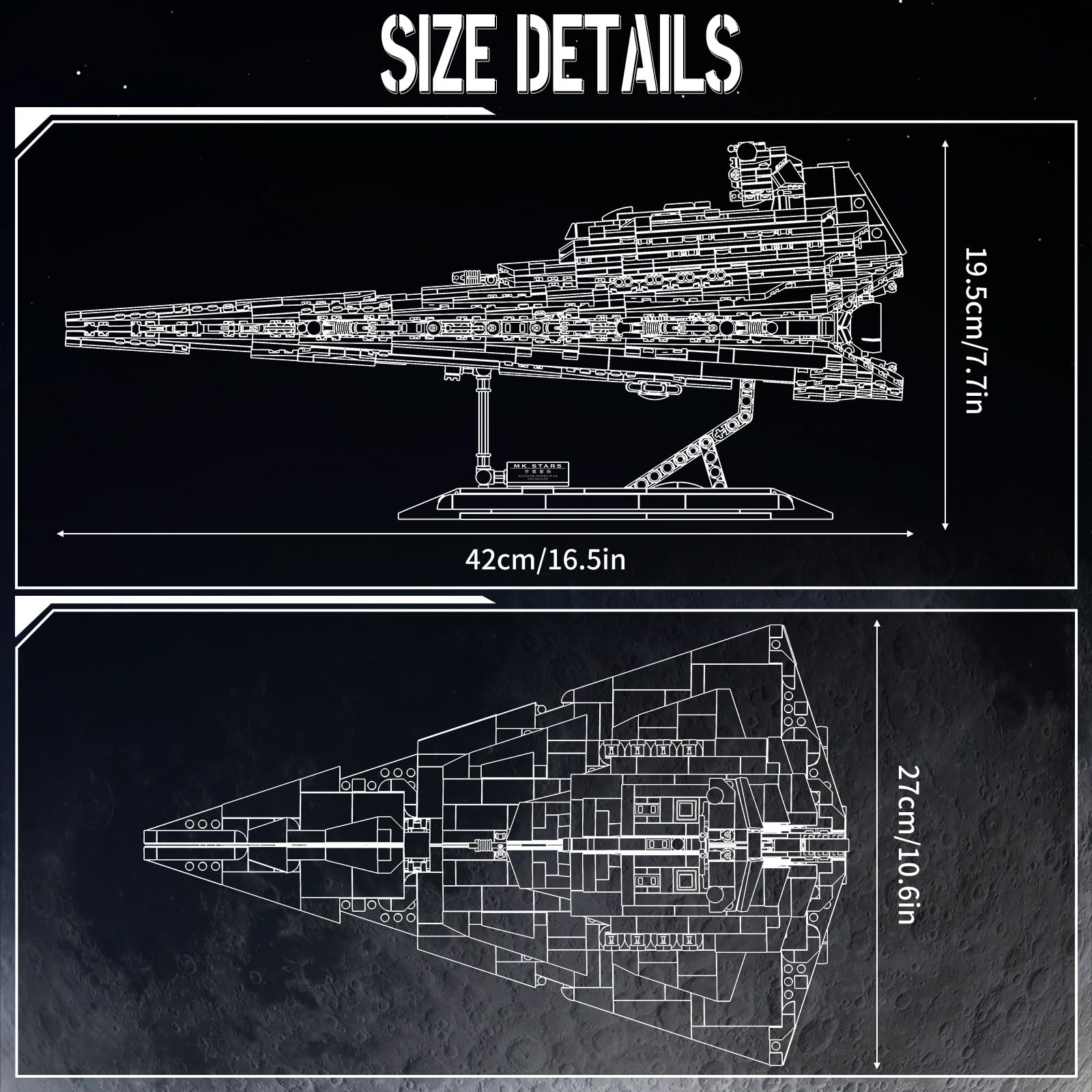 2. Entregado con una base de soporte – El Star Destroyer de la clase Resurgent mide 42 cm de longitud, 27 cm de ancho y 19.5 cm de altura. El crucero de ataque en sí es extremadamente robusto y visualmente atractivo.