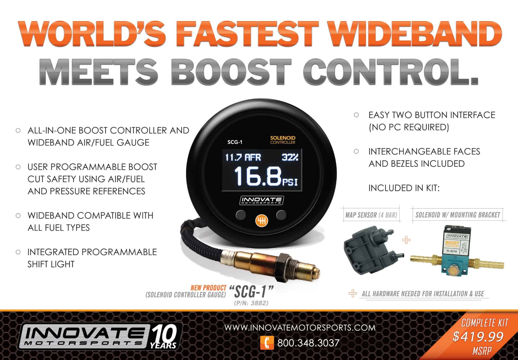El Innovate Motorsports SCG-1 es un enfoque revolucionario para el control de presión que integra un avanzado controlador de presión independiente con la tecnología líder en la industria de relación de aire combustible de Innovate. Cuando decidimos construir un controlador de presión, sabíamos que teníamos que ofrecer más capacidades que otros productos disponibles hoy en día, manteniendo al mismo tiempo la funcionalidad fácil de usar demandada por nuestros clientes. En lugar de empaquetar la misma tecnología de control de presión que se ha utilizado durante décadas, elegimos combinar nuestra avanzada tecnología de control de sensor O con nuestro nuevo controlador de solenoide propietario que proporciona una precisión, respuesta y seguridad superiores en el control de presión. También agregamos una luz de cambio programable por el usuario y alojamos todo el paquete en un cuerpo de medidor compacto para facilitar la instalación y el uso. Al igual que con todos nuestros productos de relación aire/combustible, el SCG-1 utiliza la única tecnología de relación aire/combustible 100 por ciento digital para proporcionar retroalimentación en tiempo real al SCG-1. Esta información de relación aire/combustible se muestra en una pantalla OLED integrada junto con la presión del múltiple y el estado de la wastegate. La información de relación aire/combustible también se utiliza para proporcionar un corte de refuerzo definido por el usuario que mejora el margen de seguridad sobre la mayoría de las ofertas de la competencia que sólo se basan en el umbral de sobrealimentación. El SCG-1 tiene una salida analógica totalmente programable ideal para aplicaciones que utilizan ECU independientes, ECU de pinza o registradores de datos externos. El SCG-1 también cuenta con una entrada/salida digital para integrarse con nuestros otros dispositivos del Sistema de Ajuste Modular (MTS). Esta misma salida digital se puede utilizar para registrar la relación aire/combustible, el ciclo de trabajo del solenoide, la velocidad del motor y la presión del múltiple con nuestro software gratuito LogWorks PC para ayudarlo a ajustar una curva de refuerzo perfecta.