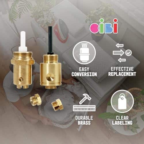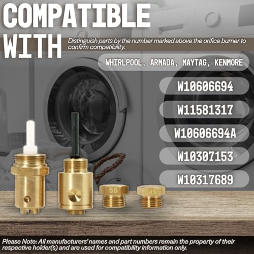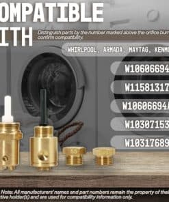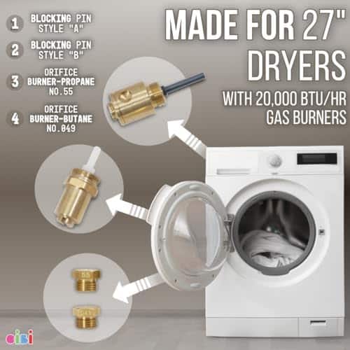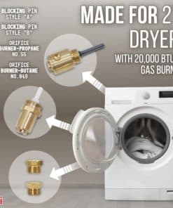 Kit de Conversión a Propano para Secadora CIBI para Secadoras de 27» a Gas LP con 20000 BTU/Hr – Compatible con W11581317, Whirlpool, Armada, Maytag, Kenmore. Diseñado para convertir secadoras de consola frontal o trasera de 27″ con quemadores de gas de 20,000 BTU/hr de gas natural a gas LP. Fabricado con materiales de latón de alta calidad que garantizan un rendimiento duradero y una sustitución efectiva. Incluye: (1) Hoja de instrucciones, (1) Pasador de bloqueo estilo «A», (1) Pasador de bloqueo estilo «B», (1) Orificio quemador-butano 49, (1) Orificio quemador-propano 55, (1) Etiqueta: Placa de calificación de conversión, (1) Etiqueta: Registro de conversión. Compatible con W11581317, W10606694A, W10307153, W10317689, W10606694, Whirlpool, Armada, Maytag, Kenmore. Distinga las piezas por el número marcado sobre el orificio del quemador. Al instalar este kit de conversión, asegúrese de que la fuente de alimentación y el interruptor de la válvula de gas estén apagados.