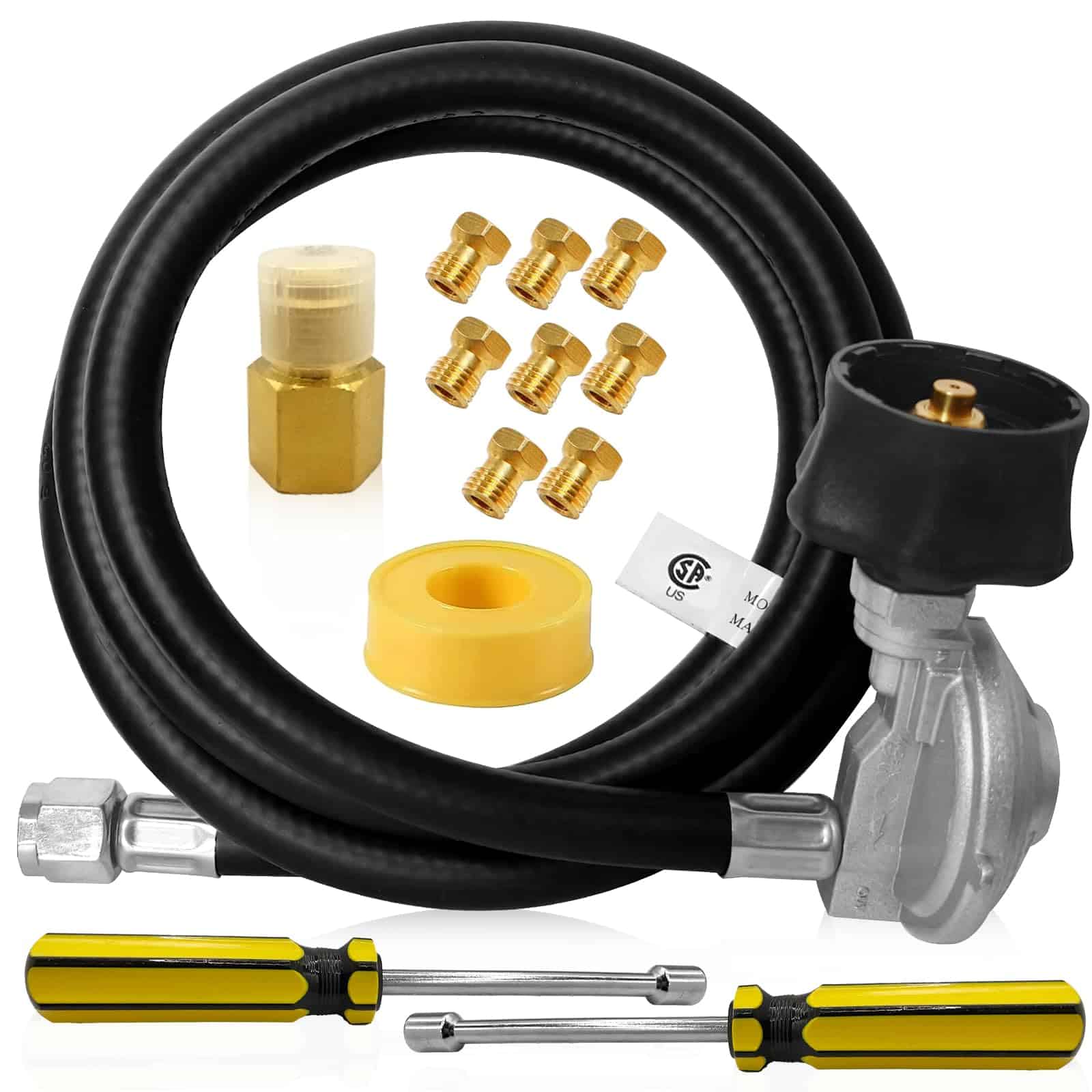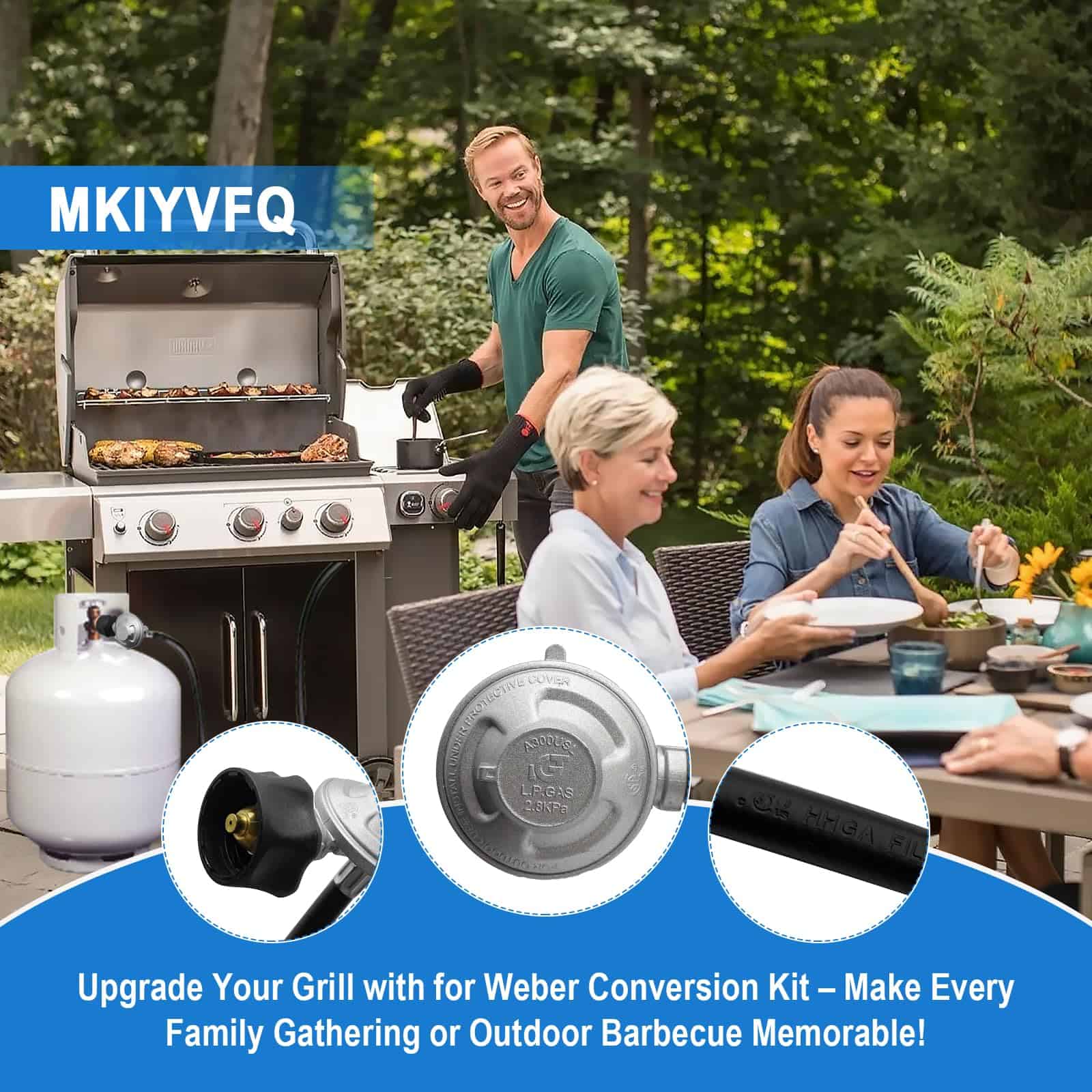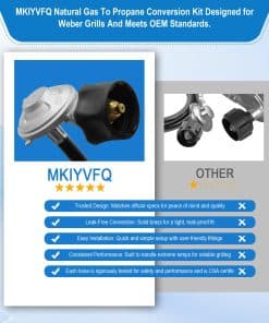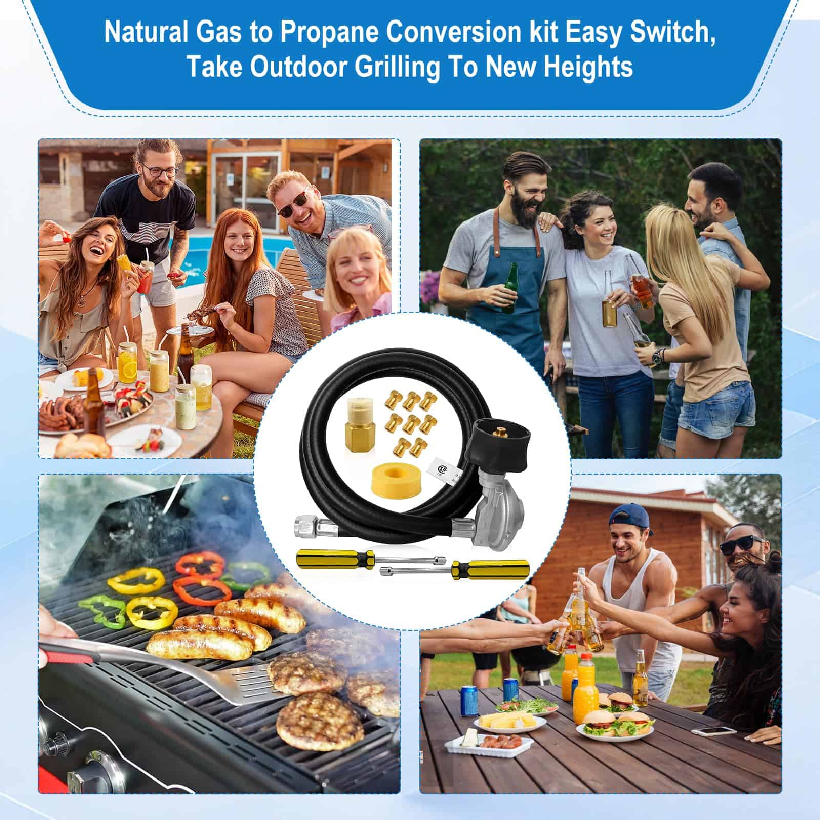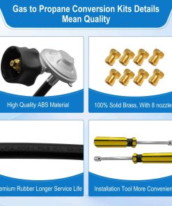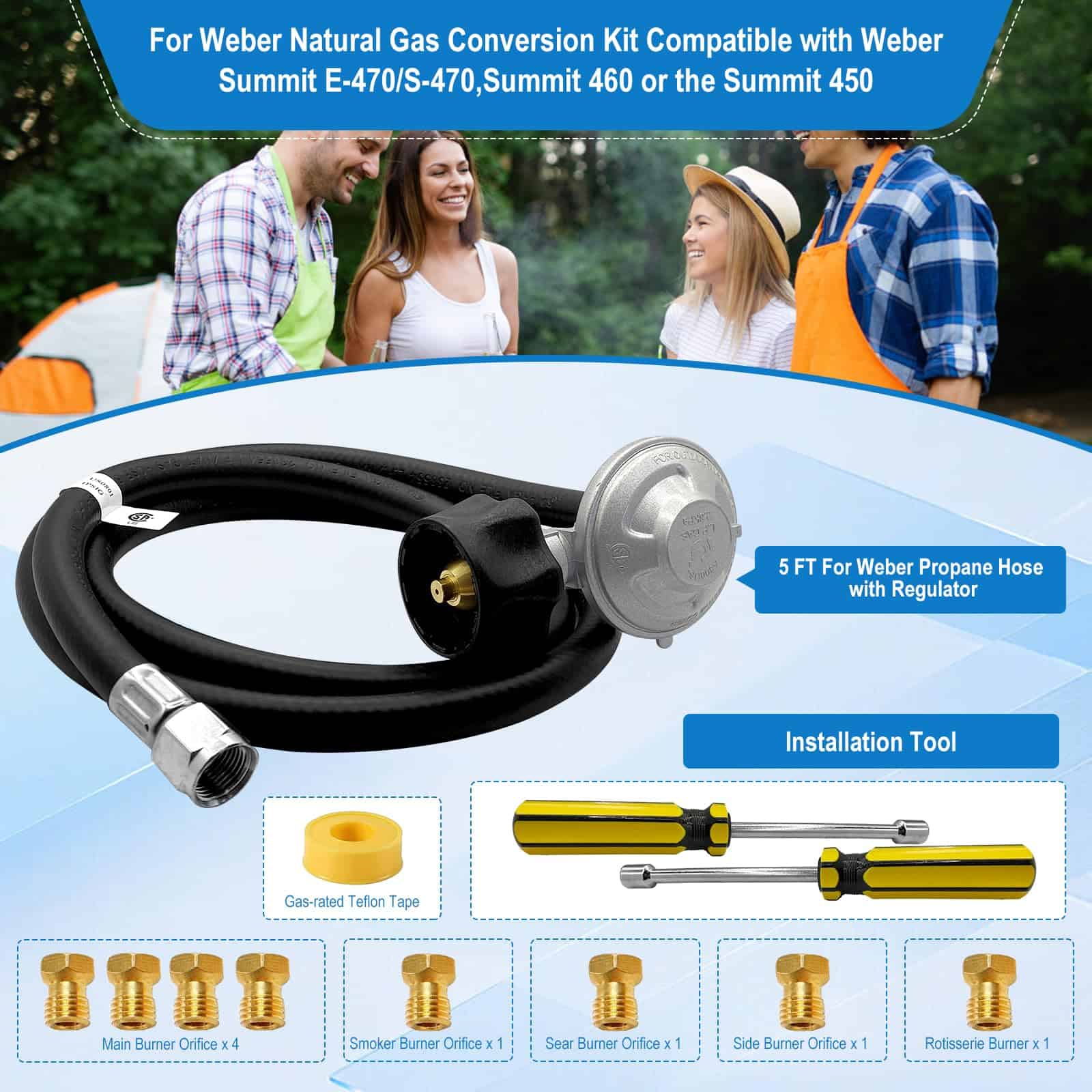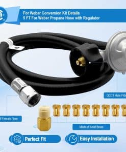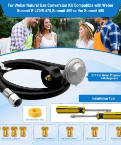 Kit de conversión de gas natural a propano para parrilla Weber Summit 470/460/450, para kit de conversión de gas a propano de Weber con manguera reguladora de propano de 5 pies. Convertir su parrilla de gas natural a propano ahora es más fácil con el kit de conversión de gas natural a propano de Sekvira. Este kit específico para el modelo Weber Summit 470/460/450 garantiza una conversión suave y segura, con orificios de LP perforados a mano para una coincidencia perfecta de BTU. Ya sea que esté asando en su patio trasero o de viaje, este kit tiene todo lo necesario para una configuración sin problemas. Realice la transición a la potencia del propano y disfrute de cocinar sus comidas favoritas de manera sencilla, rápida y confiable. El kit incluye una manguera de 5 pies con regulador de propano, orificios de LP especializados, una llave de vaso y cinta de teflón clasificada para gas, todo lo necesario para una conversión suave y confiable. Diseñado para mejorar el flujo de aire y aumentar el rendimiento de la parrilla, este kit es la solución perfecta para una parrilla mejor, una configuración más fácil y comidas más deliciosas. El kit de conversión garantiza estabilidad de la llama gracias a las boquillas específicas para cada modelo. La ingeniería de precisión asegura un ajuste perfecto, hecho con 100% latón sólido y caucho de alta calidad para una instalación fácil de usar. Note que este kit es para modelos Summit fabricados a partir de 2007 en adelante. Asegúrese de seleccionar el kit correcto de conversión a propano para su parrilla Weber y disfrute de cocinar con confianza.