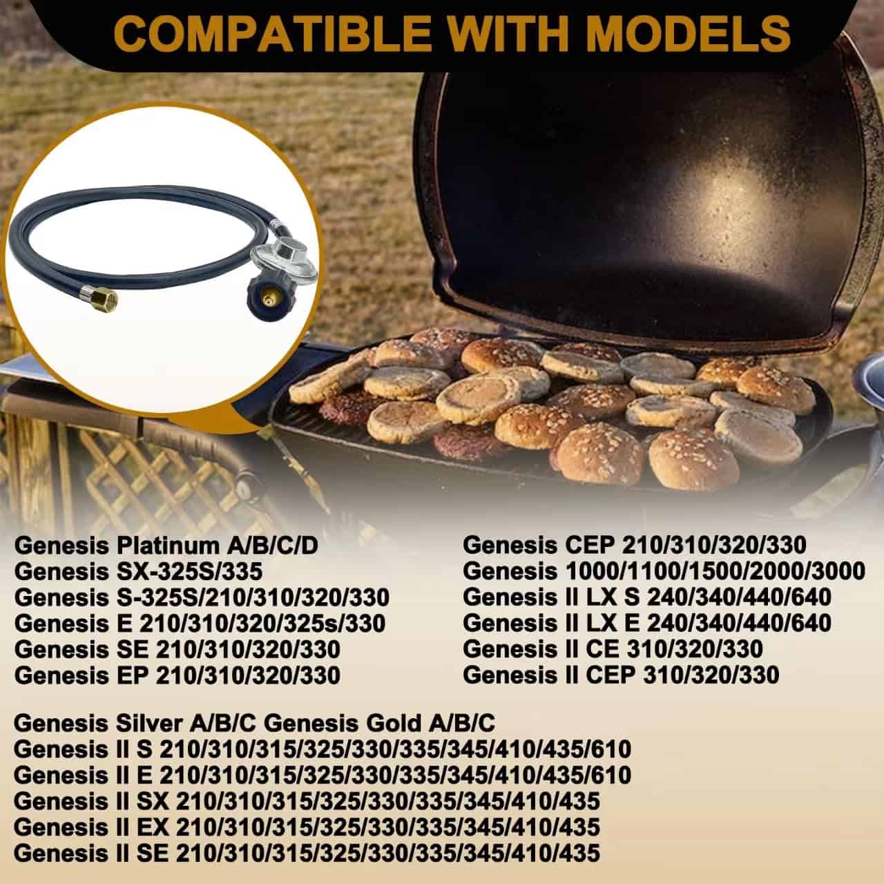 Kit de conversión de gas natural a propano Caoooort 23080901 Compatible con Weber Genesis y Genesis II, de NG a LP Incluye Regulador de Propano, Manguera y 3 Orificios con Apertura de 0.5mm. Este kit de conversión de gas natural a propano está diseñado para garantizar el tamaño y la estabilidad de la llama en su parrilla. Antes de comprar, por favor verifique el número de boquillas y el tamaño de la apertura de la boquilla de su dispositivo. Tenga en cuenta que el orificio de 0.5 mm puede no ser adecuado para todas las parrillas de propano, ya que el tamaño del BTU preestablecido de fábrica de la parrilla afecta el tamaño del orificio apropiado. El paquete viene completo con un regulador equipado con una manguera de propano de 5 pies de longitud, y 6 boquillas de inyección de latón. Convierta su parrilla de gas natural a propano (LP) de forma fácil y segura con este kit de conversión. El kit es compatible con parrillas Weber Genesis o Genesis II, reemplazando los modelos Genesis Silver/Gold/Platinum/SX/S/E/SE/EP/CEP 210, 310, 320, 325s, 330, Genesis II Genesis II S/E/SX/EX/SE 210, 315, 325, 330, 335, 345, 410, 435, 610, Genesis II LX S/E 240, 340, 440, 640. Los materiales de calidad incluyen boquillas de latón al 100% y regulador de aluminio para propano, manguera de goma de 5 pies. El conector de tanque de agua QCC-1 y la hembra de 3/8″ garantizan una conexión segura. El kit ha sido diseñado con altos estándares de seguridad, estanqueidad excepcional, resistencia al envejecimiento, y una larga vida útil. La instalación es sencilla, ya que para la mayoría de las parrillas de propano Weber Genesis y Genesis II, solo necesita retirar el orificio de gas natural original y reemplazarlo por el orificio de propano (LP) suministrado. No se necesitan herramientas especiales ni reemplazos de equipos. Para mejorar la adaptabilidad del kit, se han incluido 6 boquillas de inyección para satisfacer sus necesidades. Disfrute de la comodidad de convertir su parrilla de gas natural a propano sin comprometer la compatibilidad. El kit ha sido inspeccionado antes de salir de fábrica, cumple con los estándares y cuenta con la certificación CSA para garantizar un uso seguro. Nuestro equipo de servicio al cliente está disponible las 24 horas, los 7 días de la semana, para atender sus preguntas o inquietudes durante la compra y el uso del kit de conversión de parrilla de gas natural.