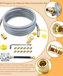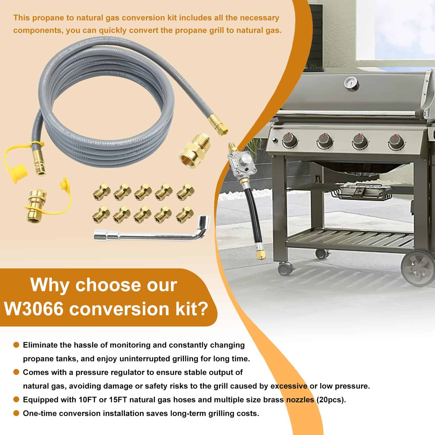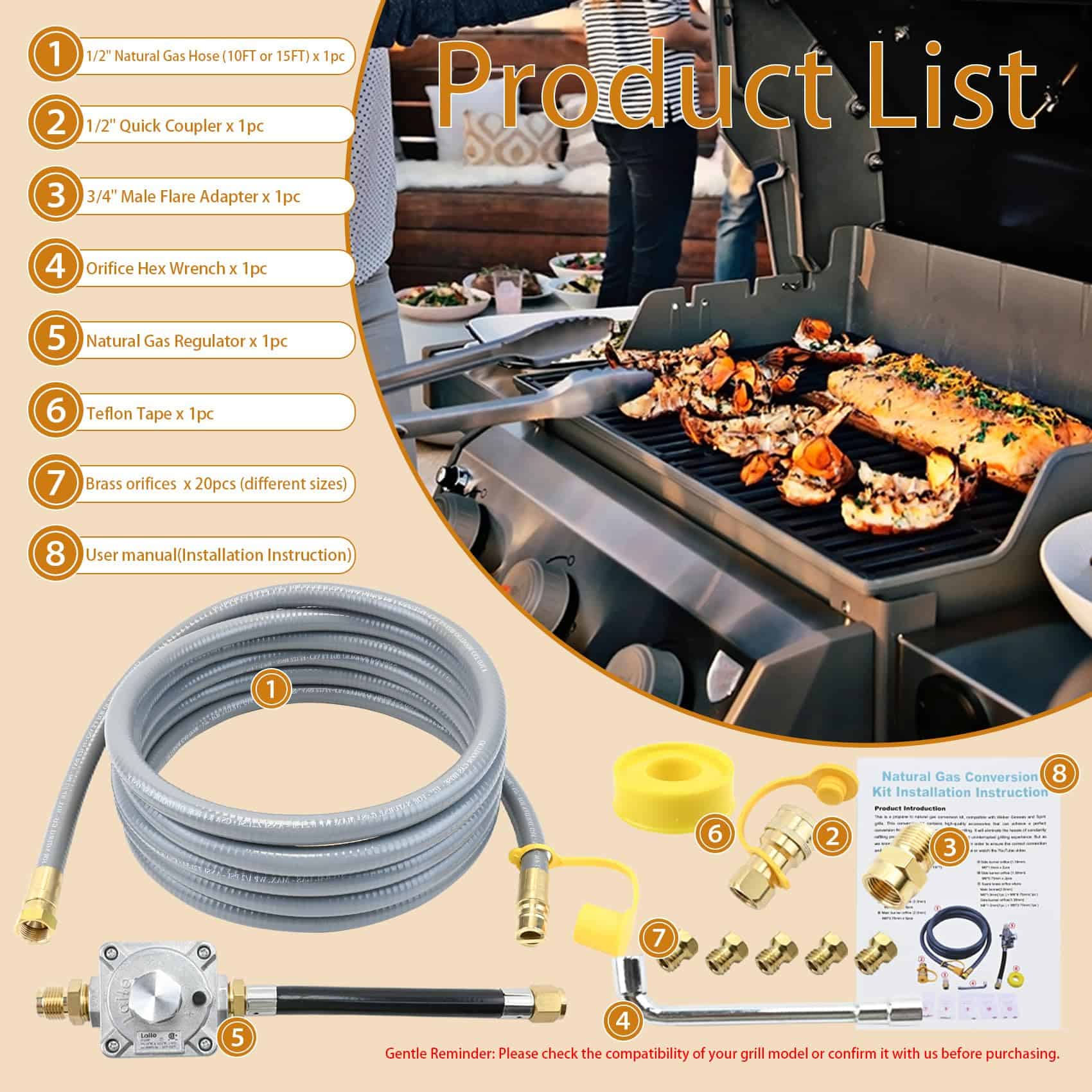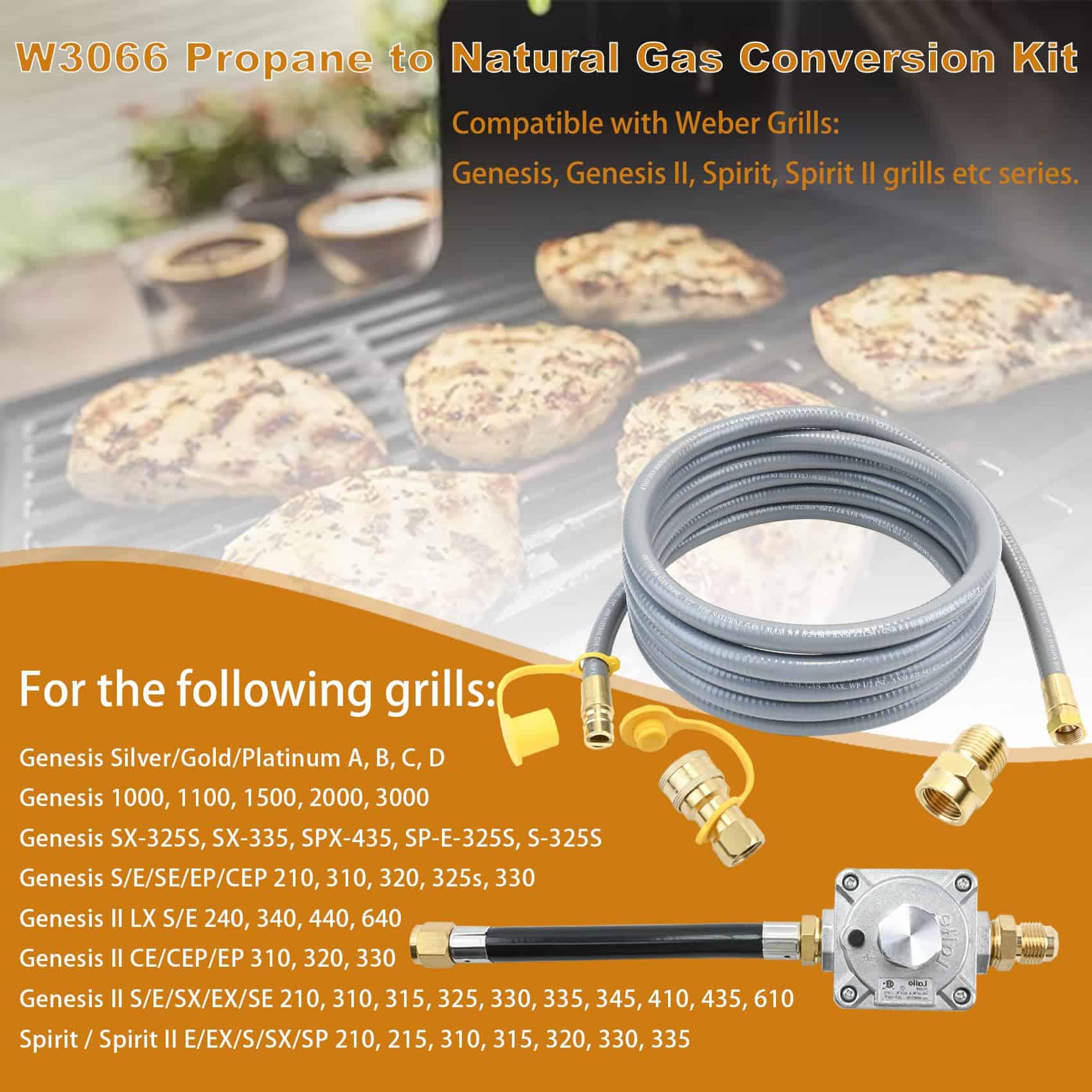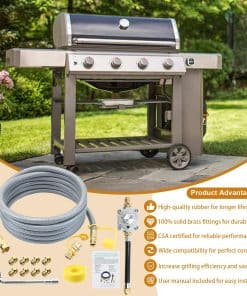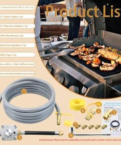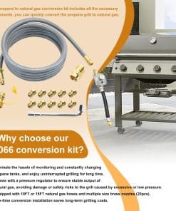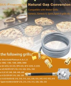Este kit de conversión de gas natural W3066 incluye dos tamaños de orificios (16 piezas) y orificios de repuesto adicionales (4 piezas) para mantenimiento y reemplazo exitosos en caso de pérdida de orificios y desgaste a largo plazo. El regulador de alta calidad garantiza una salida de gas natural estable, mejorando la eficiencia de la parrilla, eliminando la molestia de tener que rellenar constantemente tanques de propano, permitiéndole cocinar tanto como desee. Compatible con parrillas Weber Genesis, Genesis II, Spirit, Spirit II, etc. El kit incluye manguera de gas natural de 1/2″ (10FT o 15FT), regulador de gas natural, acoplador rápido de 1/2″, adaptador macho de 3/4″ con brida, llave hexagonal de orificio, orificios de latón (16 piezas + 4 piezas de repuesto), cinta de PTFE resistente a altas temperaturas y manual de usuario. Ofrecemos garantía de un año. Si el producto tiene algún problema de calidad o el paquete está dañado y se pierden accesorios debido al transporte, por favor avísenos. Nos haremos responsables y trataremos de resolver el problema. La satisfacción del cliente es nuestro incansable objetivo.