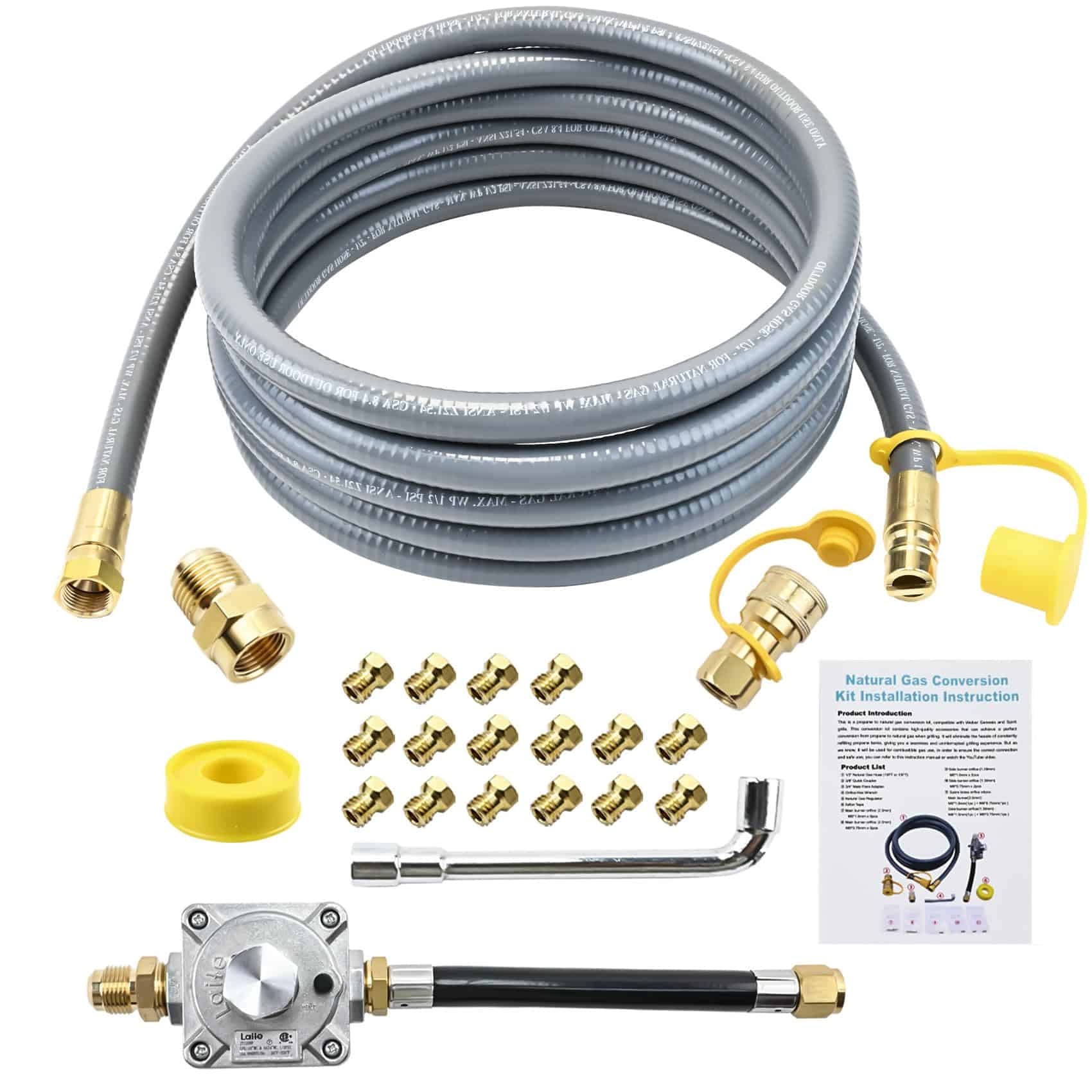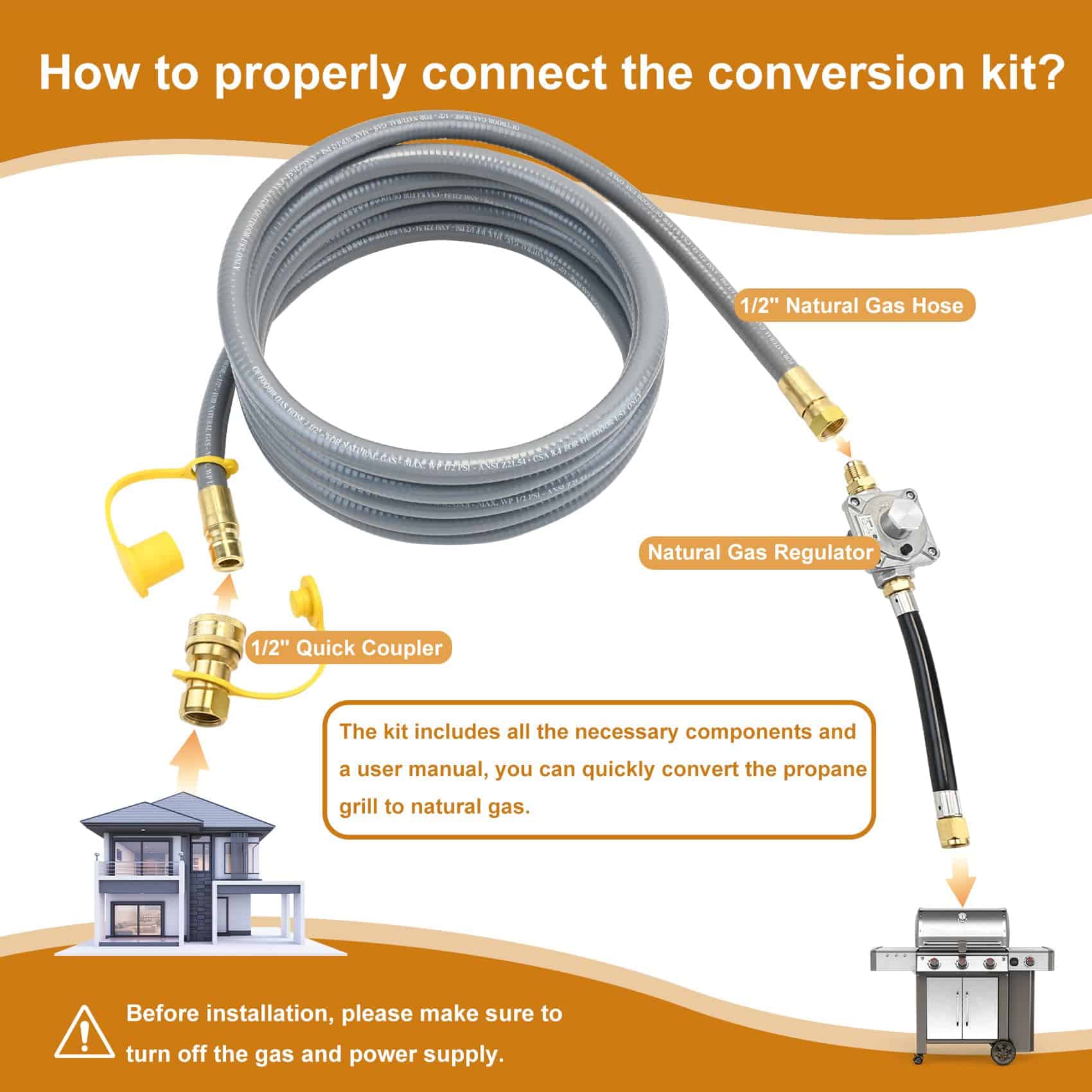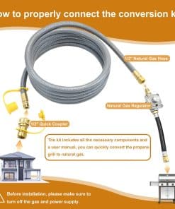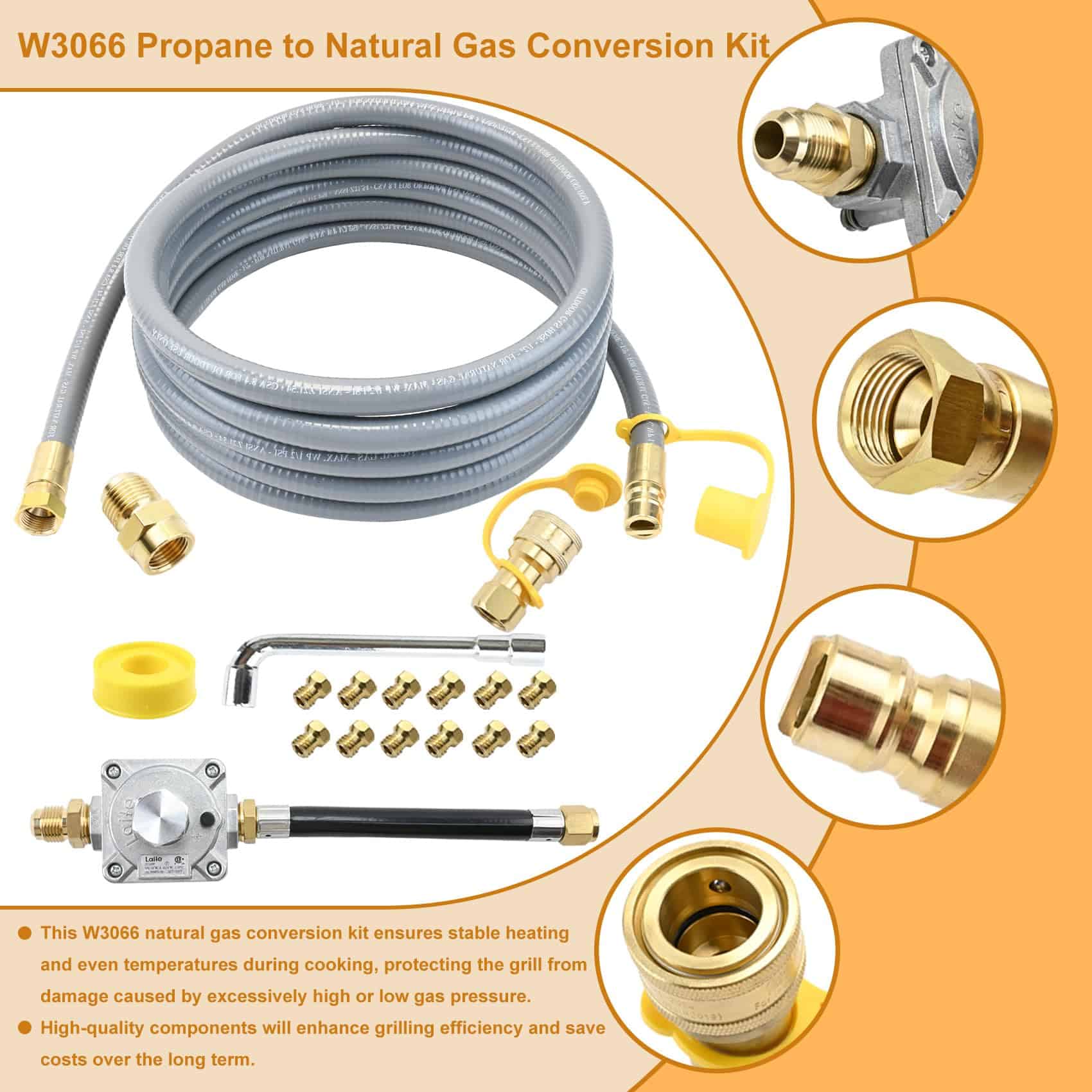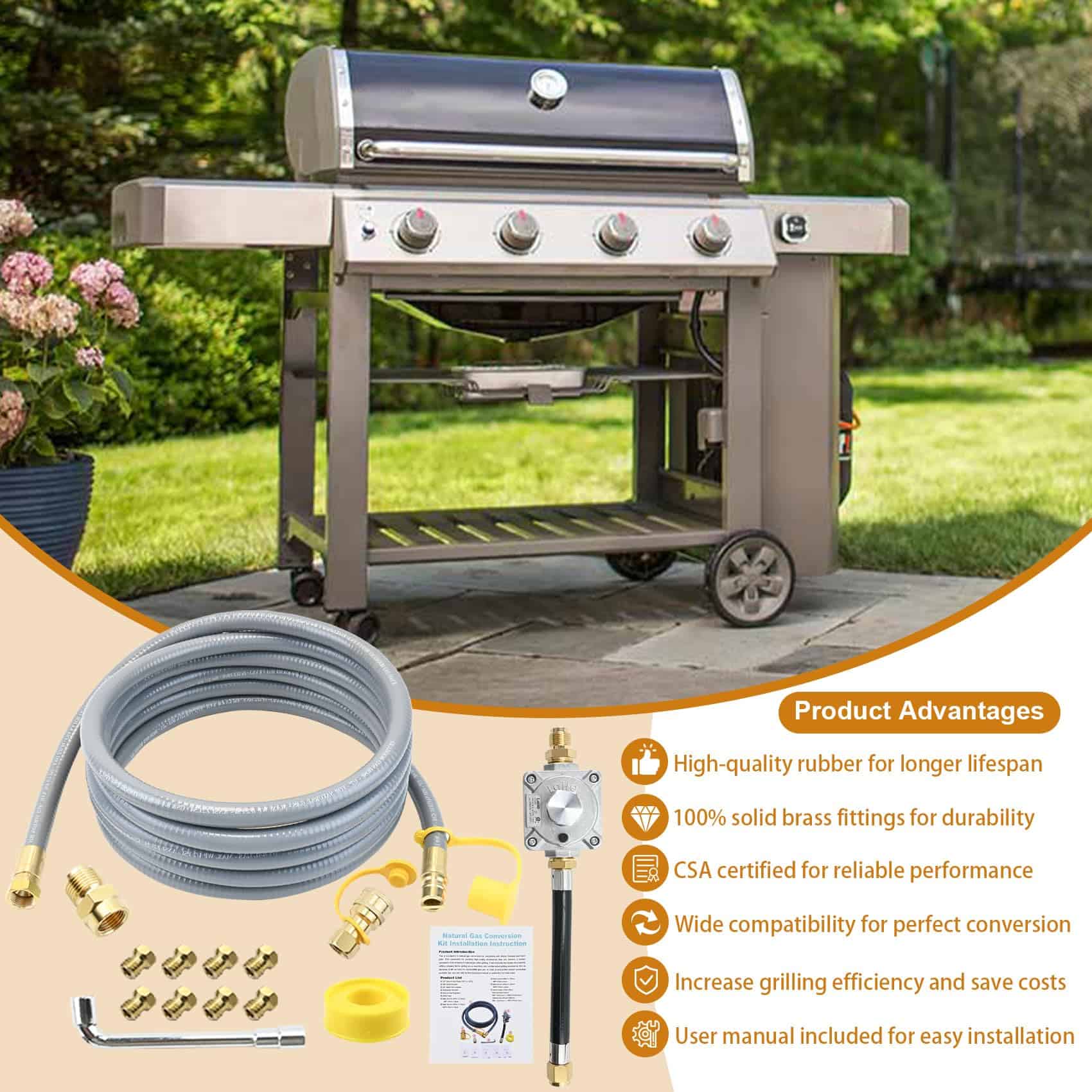 Este kit de conversión de gas natural W3066 incluye dos tamaños de orificios (16 piezas) y orificios de repuesto adicionales (4 piezas) para mantenimiento y reemplazo exitosos en caso de pérdida de orificios y desgaste a largo plazo. El regulador de alta calidad garantiza una salida de gas natural estable, mejorando la eficiencia de la parrilla, eliminando la molestia de tener que rellenar constantemente tanques de propano, permitiéndole cocinar tanto como desee. Compatible con parrillas Weber Genesis, Genesis II, Spirit, Spirit II, etc. El kit incluye manguera de gas natural de 1/2″ (10FT o 15FT), regulador de gas natural, acoplador rápido de 1/2″, adaptador macho de 3/4″ con brida, llave hexagonal de orificio, orificios de latón (16 piezas + 4 piezas de repuesto), cinta de PTFE resistente a altas temperaturas y manual de usuario. Ofrecemos garantía de un año. Si el producto tiene algún problema de calidad o el paquete está dañado y se pierden accesorios debido al transporte, por favor avísenos. Nos haremos responsables y trataremos de resolver el problema. La satisfacción del cliente es nuestro incansable objetivo.