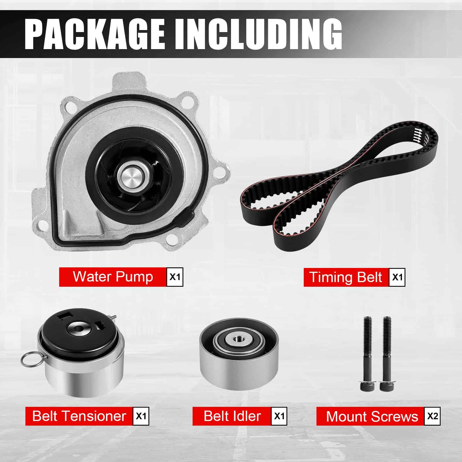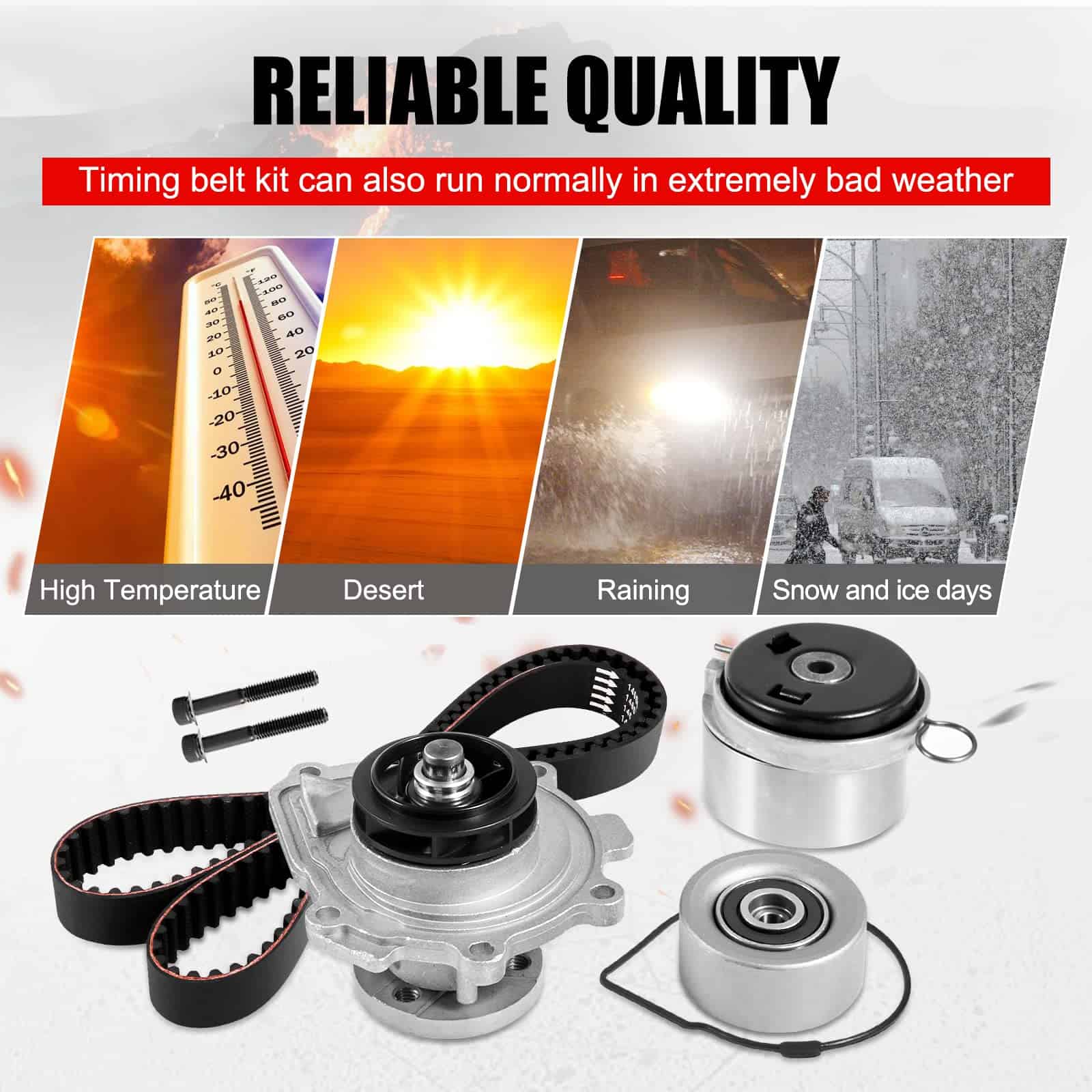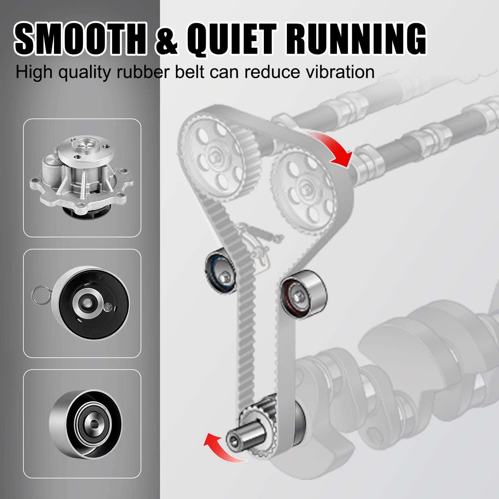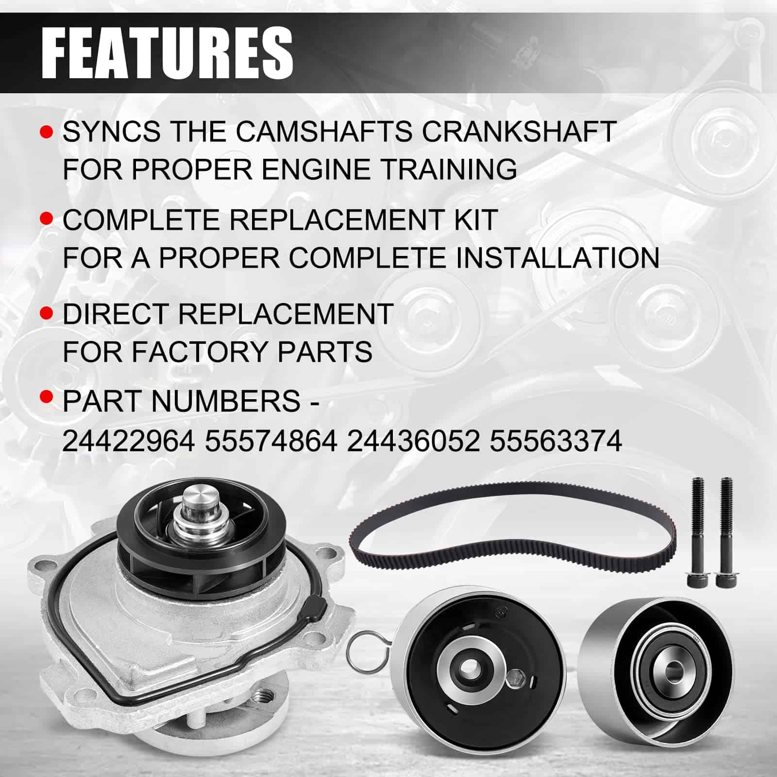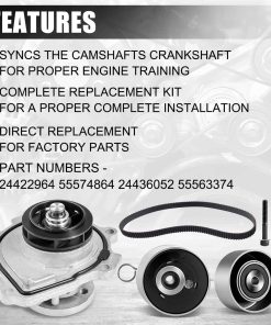 Kit de Correa de Distribución con Bomba de Agua Compatible con Chevrolet Sonic 2012-2013, Chevrolet Cruze 2012-2014, Aveo 2009-2011, Aveo5, Pontiac G3 2009-2010, Wave, Saturn Astra 2008-2009, Suzuki Swift+ 2009. Todas las partes son rigurosamente probadas para mantener su automóvil en buen estado. El kit de correa de distribución y bomba de agua puede mejorar la potencia y eficiencia del motor, con bajo ruido, baja resistencia de transmisión, y una operación estable, lo que reduce el daño al automóvil. Compatible con Chevrolet Sonic 2012-2013, Chevrolet Cruze 2012-2014, Aveo 2009-2011, Aveo5, Pontiac G3, Wave 2009-2010, Saturn Astra 2008-2009, Suzuki Swift+ 2009. Los kits de correa de distribución y bomba de agua están fabricados para cumplir con los requisitos clave del fabricante automotriz en cuanto a calidad OE para garantizar un rendimiento óptimo duradero. Reemplace 2442964 55574864 24436052 55563374 24405895. El kit de correa de distribución puede funcionar normalmente incluso en condiciones climáticas extremadamente malas. Es resistente a altas y bajas temperaturas, resistente al desgaste y tiene una larga vida útil. TEMSONE ofrece 1 año de soporte de calidad del producto a nuestros clientes. Si tiene dudas sobre algún problema, contáctenos.