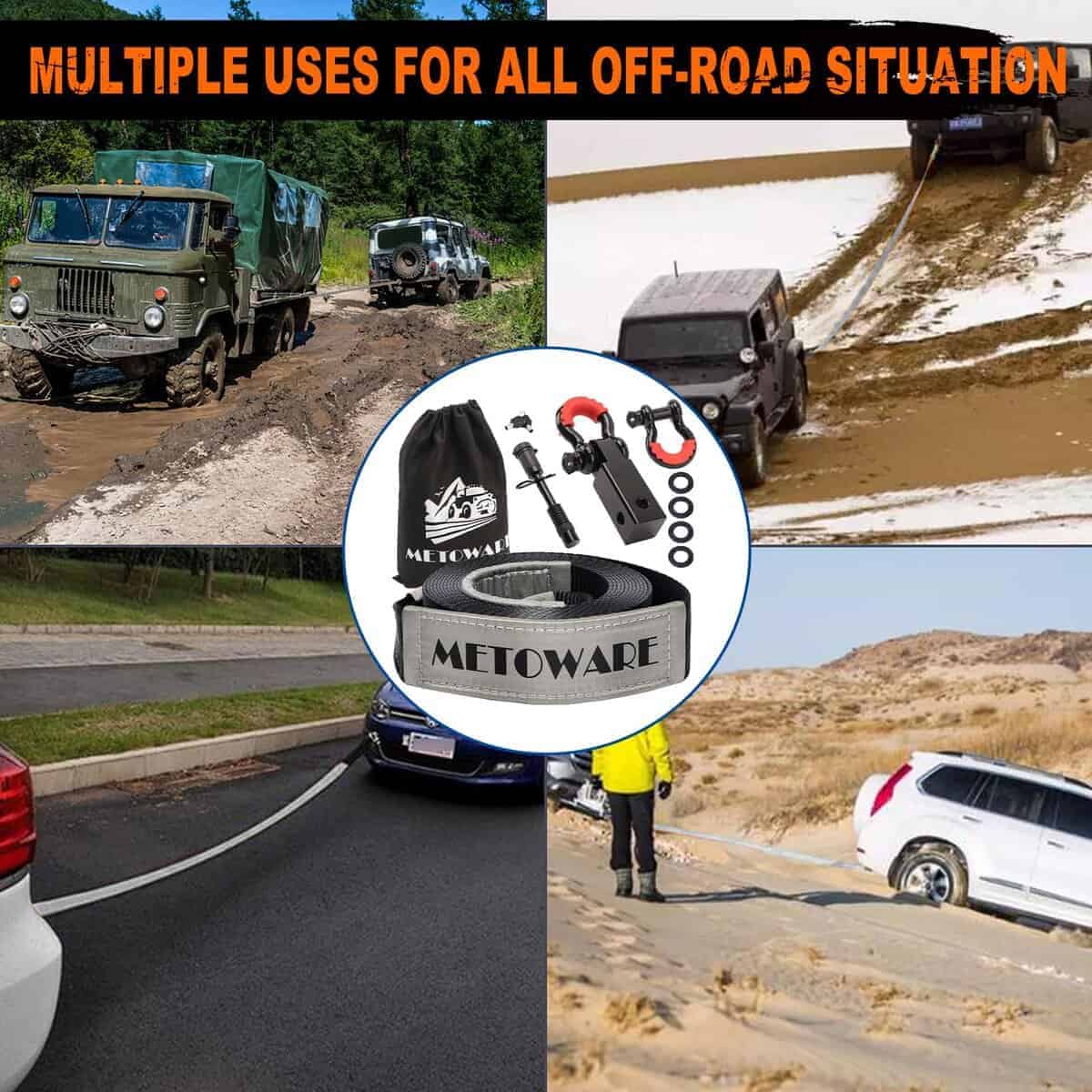 4. APLICACIONES VERSÁTILES – Con resistencia y calidad superior, el kit de recuperación de correa de remolque funciona bien con camionetas de tamaño completo, ATV, SUV, UTV e incluso barcos! Es una cuerda de recuperación ideal para remolcar camiones grandes, tirar de equipos pesados y herramienta esencial para todoterrenos, personal de emergencia, agricultores o cualquier persona que necesite transportar objetos pesados.