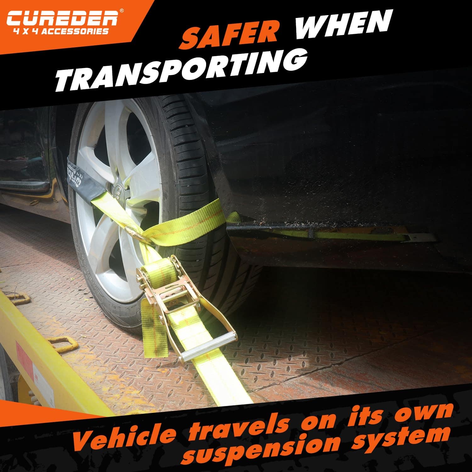 3. Correas de Neumáticos Duraderas y Pesadas para un Remolque de Automóviles: Las correas para ruedas Cureder para transportar automóviles están hechas de material de poliéster de grado industrial con revestimiento de resistencia a los rayos UV y al desgaste. Prueba de laboratorio con carga de trabajo segura de 3300 libras y resistencia a la rotura de 9900 libras.