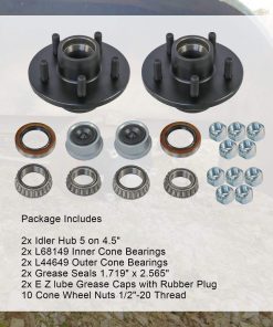 2. Los kits también incluyen: 2x cojinetes de cono interiores L68149 y 2x cojinetes de cono exteriores L44649, 2x sellos de grasa 1.719″ x 2.565″, 2x tapas de grasa E Z lube con tapón de goma; 10 tuercas de rueda de cono 1/2″-20 rosca.