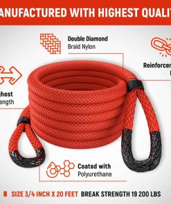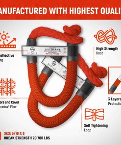 Los accesorios todoterreno, de Miolle, se pueden usar con todo tipo de coches, furgonetas, camiones compactos y de tamaño completo, SUV, UTV y ATV. Funciona perfectamente en todos los climas. ¿Por qué elegir la Cuerda de Recuperación Cinética de Miolle sobre las Correas de Recuperación u otras marcas? El kit de recuperación todo terreno de Miolle incluye: 2 Soft Shackles Miolle 3/8 (25000 lbs) MBS hechos de fibra UHMWPE. Cuerda de Nylon de alto tenacidad de doble trenzado al 100%. Relación resistencia-peso más alta para productos de recuperación. 45% más fuerte y ligera que el cable de acero. Más efectiva: se estira hasta un 30% de su longitud original, por lo que almacena y transfiere más energía. Puede absorber cargas de choque de manera efectiva. Con la Cuerda de Recuperación, un vehículo más pequeño puede recuperar un vehículo más grande y pesado. Las correas de recuperación están fabricadas con nylon que tiene menos estiramiento: solo 10-15%, y una relación resistencia-peso más baja que las Cuerdas de Recuperación. La Snatch Strap es más rígida, más peligrosa, más grande y más voluminosa que las Cuerdas de Recuperación con la misma carga de trabajo. ¿Qué tan segura es la Cuerda de Recuperación Cinética de Miolle? La Cuerda de Recuperación es la forma más segura y fácil de sacar un vehículo atascado. Las cadenas, cables y correas de remolque se convierten en látigos peligrosos cuando se rompen bajo una carga pesada y pueden causar lesiones graves. La cuerda de nylon es más suave que las cadenas o correas de remolque, por lo que presenta menos riesgo de lesiones. Siempre tome precauciones para minimizar el riesgo: los espectadores deben estar al menos a 50 pies de distancia de los vehículos en todas las direcciones. Coloque un amortiguador de línea lleno o una manta pesada sobre la cuerda para minimizar el látigo en caso de que se rompa.