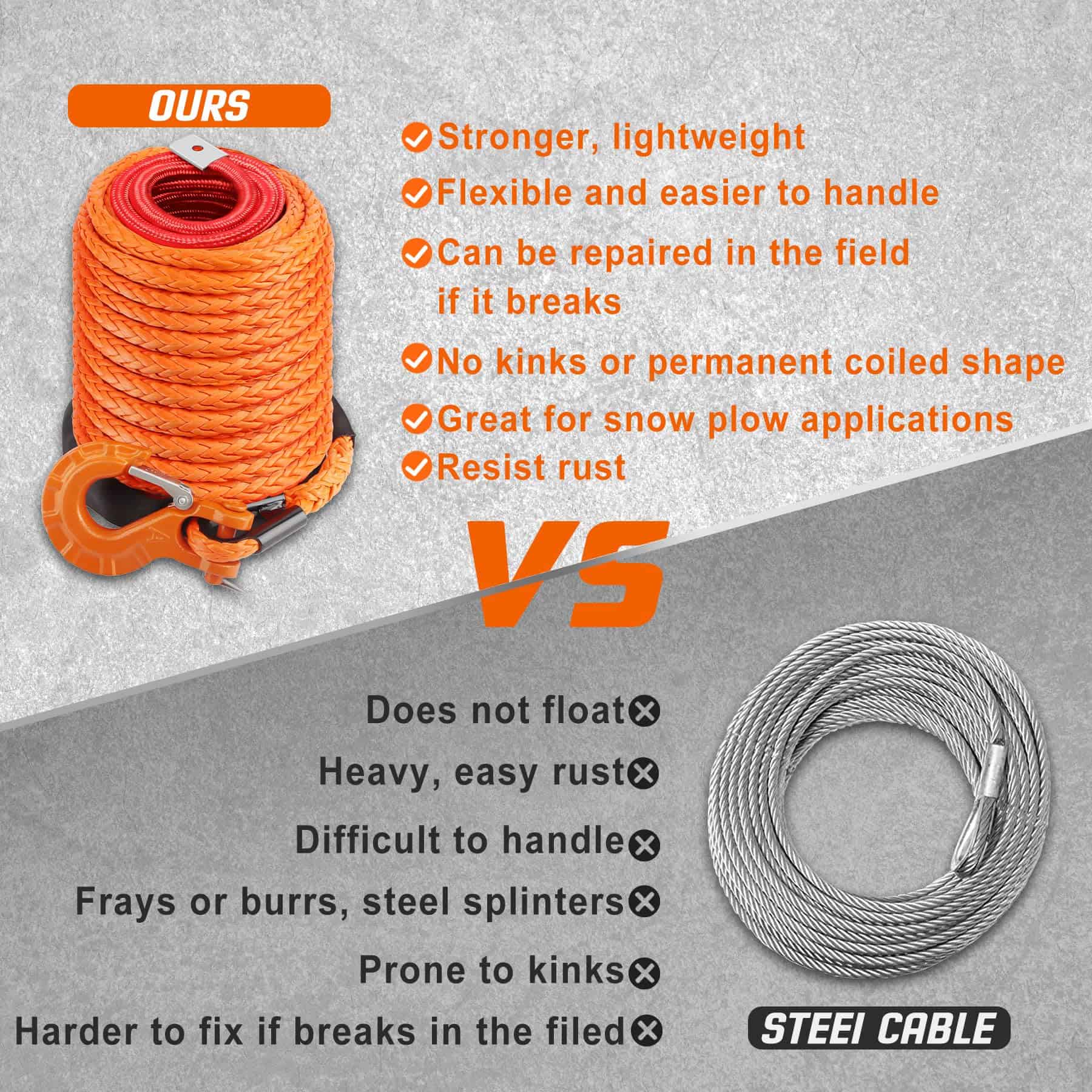 Esta Cuerda Sintética para Malacate está hecha de un material especial de polietileno estructura de 12 hebras tratado térmicamente que puede proporcionar una Resistencia a la Tensión de 23,000 lbs, cubierta con Recubrimiento de Poliéster. Extremadamente ligera, flota en agua, fácil de manejar y empalmar. Más fuerte, más ligera y más segura que los cables de acero tradicionales. Apto para la mayoría de malacates como ATV y UTV. Fácil de limpiar y no se enreda como un cable de acero.