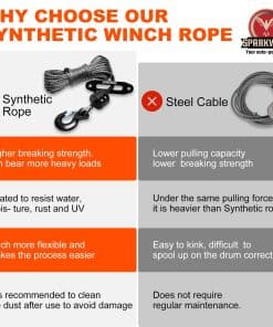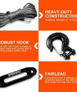 El Kit de Cuerda Sintética para Winch SPARKWHIZ es la solución perfecta para reemplazar los cables de acero tradicionales en tu ATV, UTV, SUV o camión ligero. Con una cuerda resistente y duradera, un gancho forjado de acero y una guía de aluminio resistente a la corrosión, este kit de accesorios de winch es esencial para cualquier entusiasta de las actividades al aire libre. La cuerda sintética está tratada con un recubrimiento especial que la hace resistente a los rayos UV y la abrasión, lo que garantiza una larga vida útil y un rendimiento superior en comparación con los cables de nylon tradicionales. Además, la cuerda de winch SPARKWHIZ es más ligera que los cables de acero convencionales, lo que facilita su uso y almacenamiento. Con un diseño de 12 hebras trenzadas de UHMWPE ultra resistente, esta cuerda tiene una resistencia a la rotura de hasta 10,000 lbs, lo que la hace ideal para su uso en entornos exigentes. Los accesorios premium incluidos en el kit, como los ganchos de acero con recubrimiento premium, la guía de aluminio y los topes de goma, garantizan la protección de tu equipo de winch y una operación sin problemas en todo momento. No dudes en optar por el Kit de Cuerda para Winch SPARKWHIZ para actualizar tu equipo y disfrutar de un rendimiento de winch superior en todas tus aventuras todoterreno.