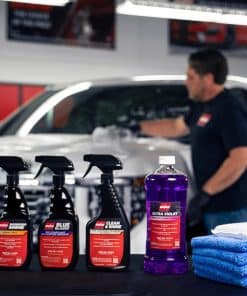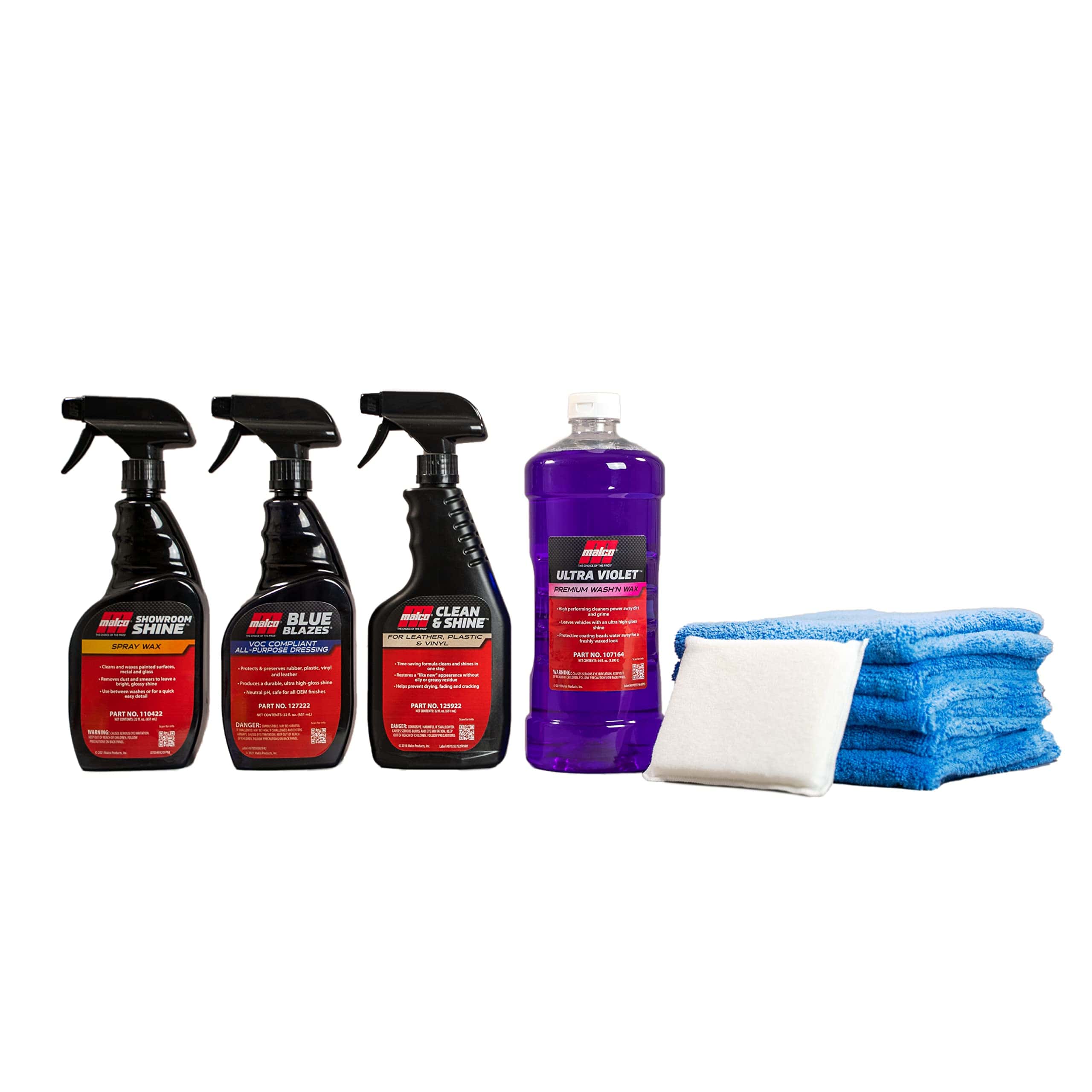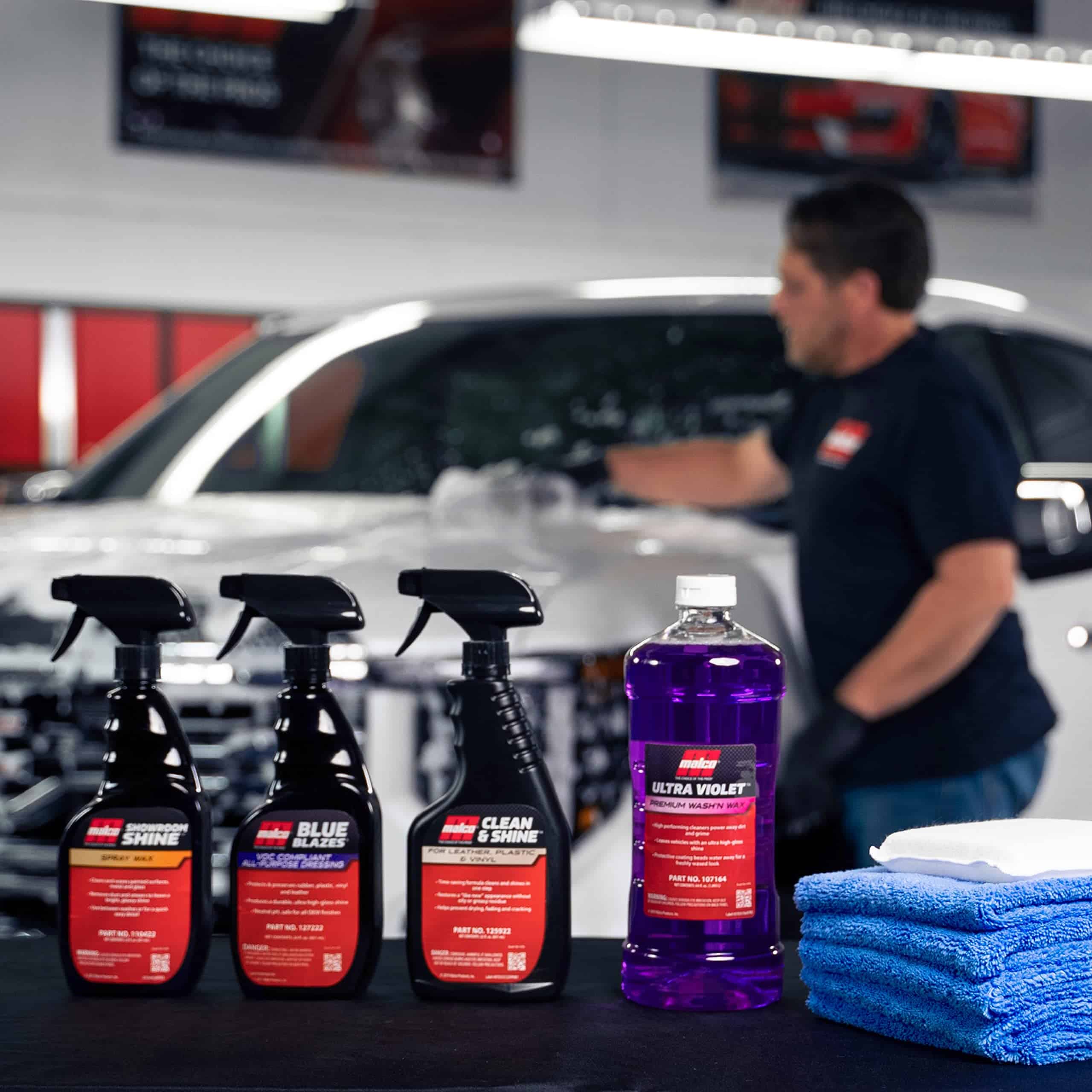 ULTRA VIOLET WASH N WAX: Actúa como un producto 2 en 1 para limpiar el exterior de sus vehículos y dejar una capa delgada de cera que ayuda a repeler el agua entre las aplicaciones de cera. SHOWROOM SHINE: Cera superior en aerosol para automóviles que elimina el polvo, la suciedad y las huellas dactilares de las superficies pintadas, de metal y de vidrio para mejorar el brillo y la reflexión y dejar un brillo intenso. CLEAN & SHINE: Limpiador multiusos que elimina la suciedad, embellece y protege las superficies de cuero, plástico y vinilo dejando un acabado satinado para un aspecto de automóvil nuevo. BLUE BLAZES: Un acondicionador todo en uno para interiores y exteriores de cuero, vinilo, caucho, plásticos y neumáticos que proporciona protección UV y deja un brillo intenso.