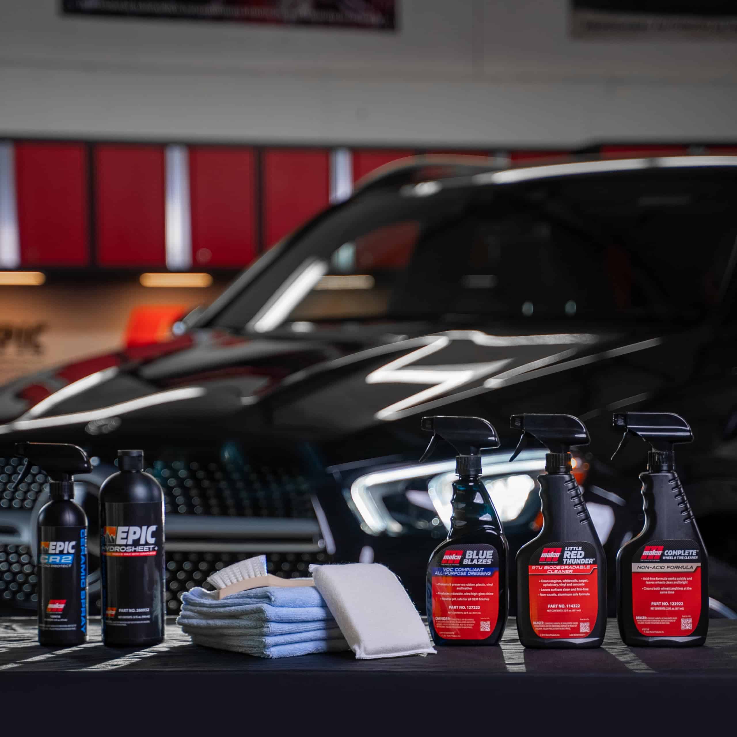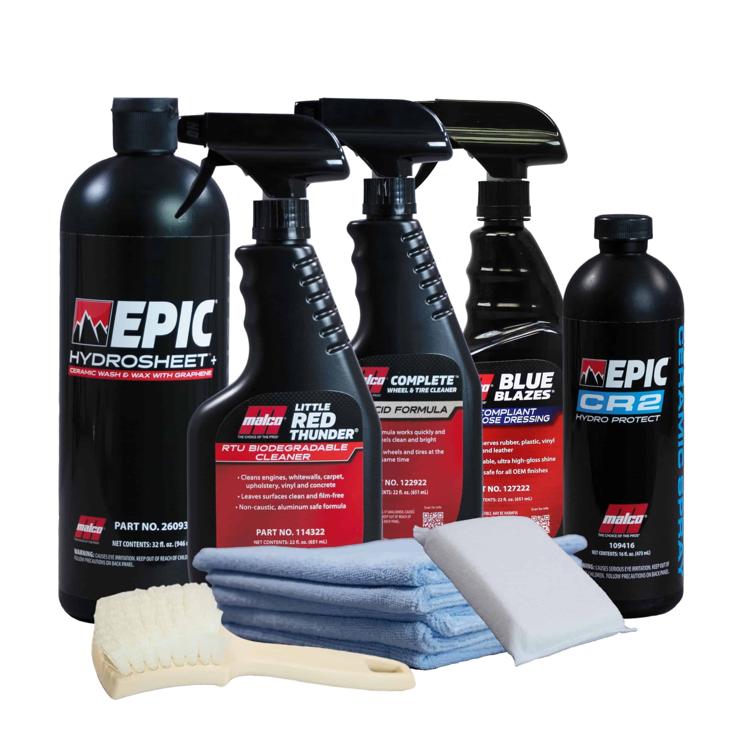 El Kit de Detallado de Autos Exterior de Malco elimina la incertidumbre al seleccionar los mejores productos de detallado para tus necesidades de detallado de autos y hace que el detallado exterior sea pan comido. Este kit de cuidado automotriz preempaquetado proporciona a los entusiastas de autos todo lo que necesitan en su arsenal para limpiar y proteger sus vehículos durante todo el año. Ofreciendo diversas soluciones de nuestros limpiadores, lavados, ceras, brillos y accesorios más vendidos, este kit de lavado de autos te ayudará a quitar rápidamente y fácilmente la suciedad y grasa, para después encerar tu vehículo a la perfección. Contenido del Kit de Limpieza de Autos: Limpiador de Autos Biodegradable Little Red Thunder, Lavado y Cera Cerámica EPIC Hydrosheet+ con Grafeno, Jabón para Lavado de Autos Complete Wheel & Tire Cleaner, Brillo para Neumáticos Blue Blazes VOC Cumplian, Brillador para Neumáticos Premium Todo Propósito, Cera en Spray Cerámica EPIC CR2 Hydo Protect, Almohadillas Aplicadoras Cuadradas, Toallas de Microfibra, Cepillo de Cerdas de Nylon. Malco Automotive es la Elección de Detallado de los Profesionales porque ofrecemos la línea de productos de limpieza automotriz más amplia disponible en la industria automotriz. Sabemos que las opciones pueden ser abrumadoras. Por eso hemos reunido los mejores kits de cuidado de autos para hacer tu elección más fácil. Asegúrate de revisar nuestras combinaciones adicionales a continuación para abordar el detallado interior, limpiador de ruedas, un kit completo de cuidado de autos y kits de pulido. Si necesitas accesorios adicionales como un guante de lavado, barra de arcilla, toallas de secado, almohadillas de pulido, rociadores o un balde de lavado, revisa la sección de accesorios del sitio web.